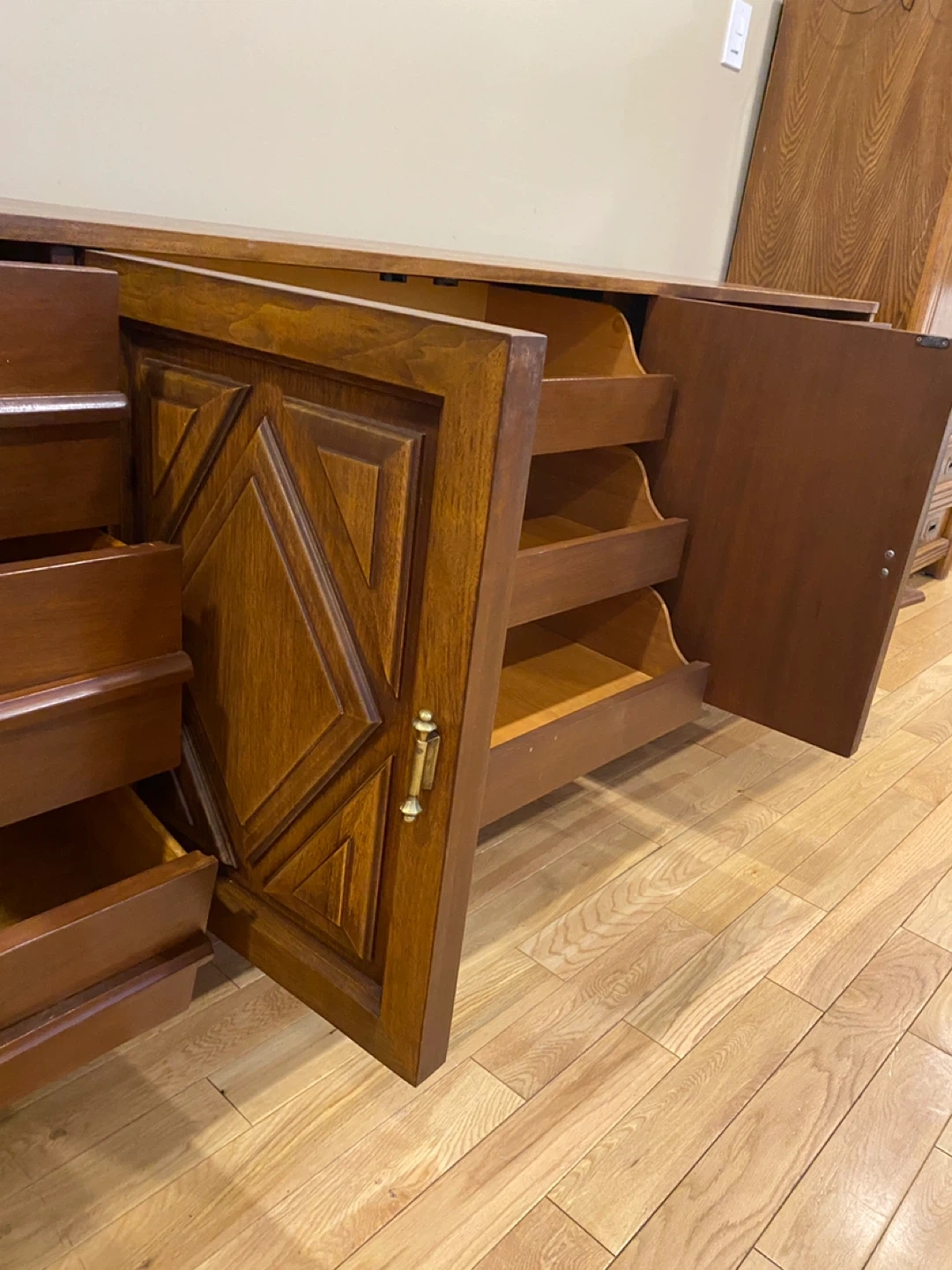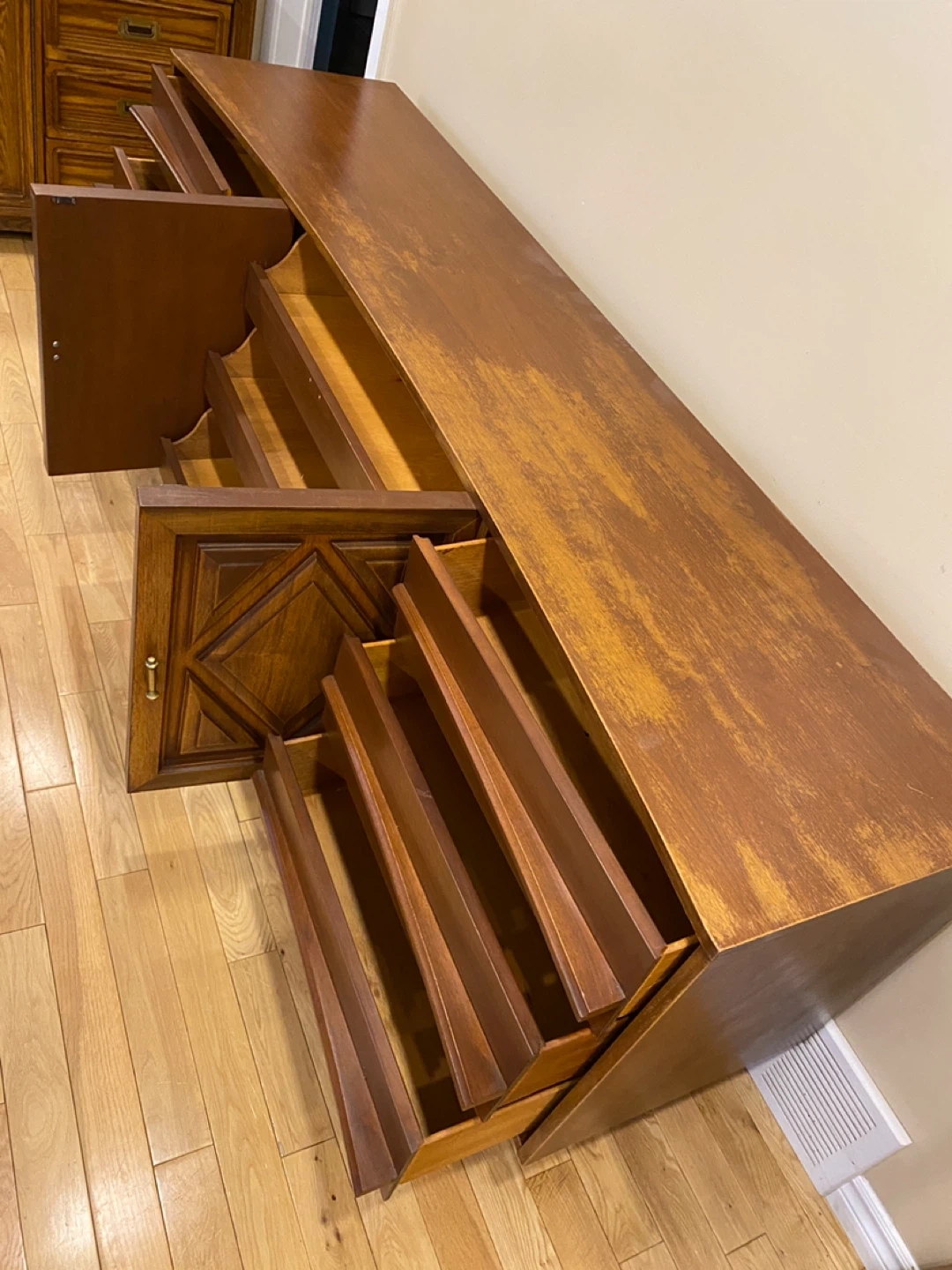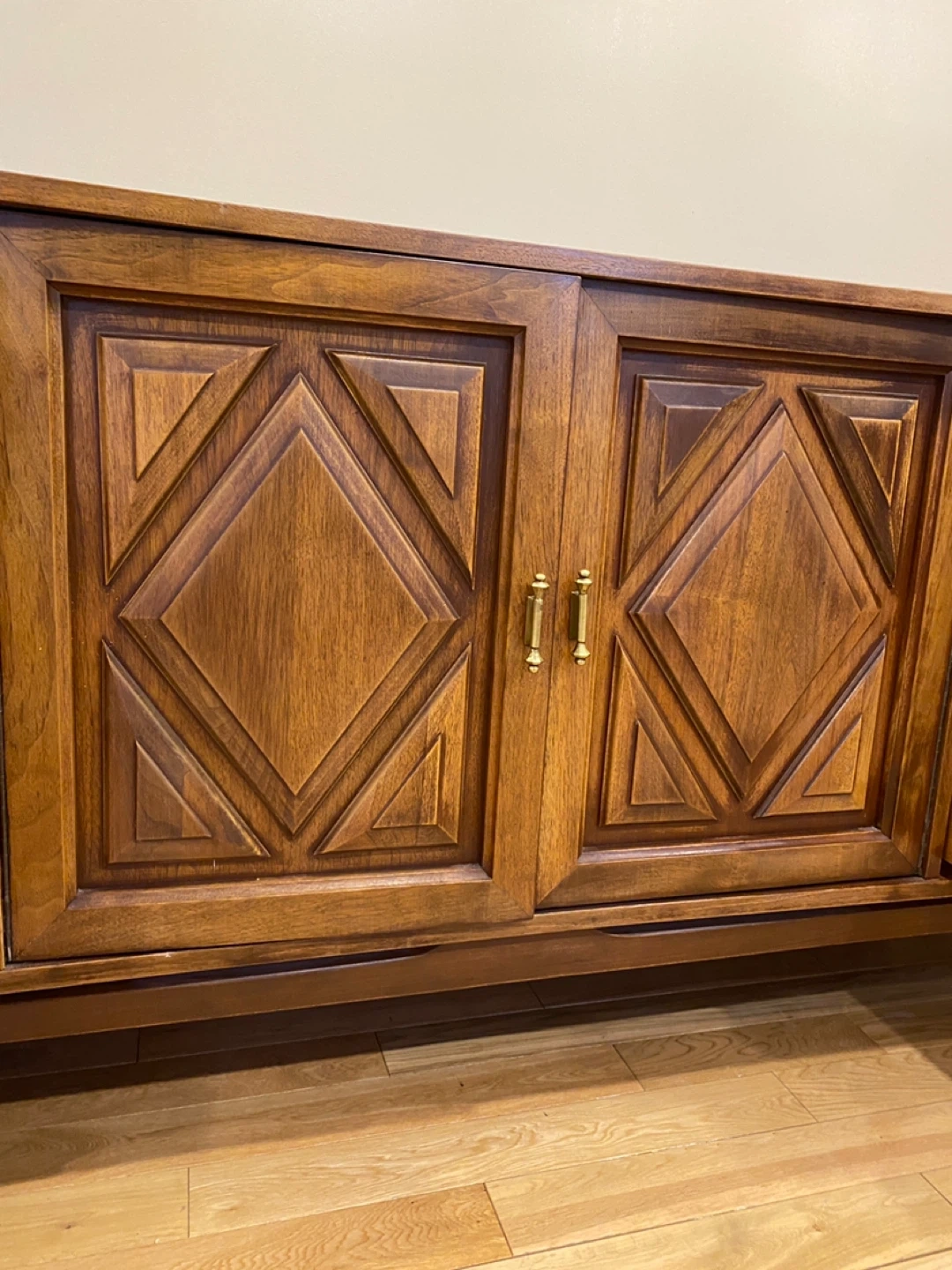 Stunning vintage mid-century modern walnut dresser with a long, low profile and beautiful architectural geometric door details. A high-quality, well-built piece from the 1950s–60s that works perfectly as a dresser, credenza, or media console.