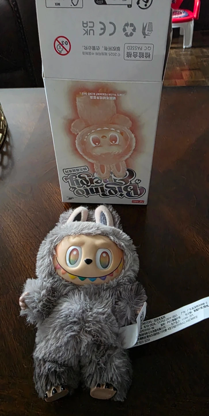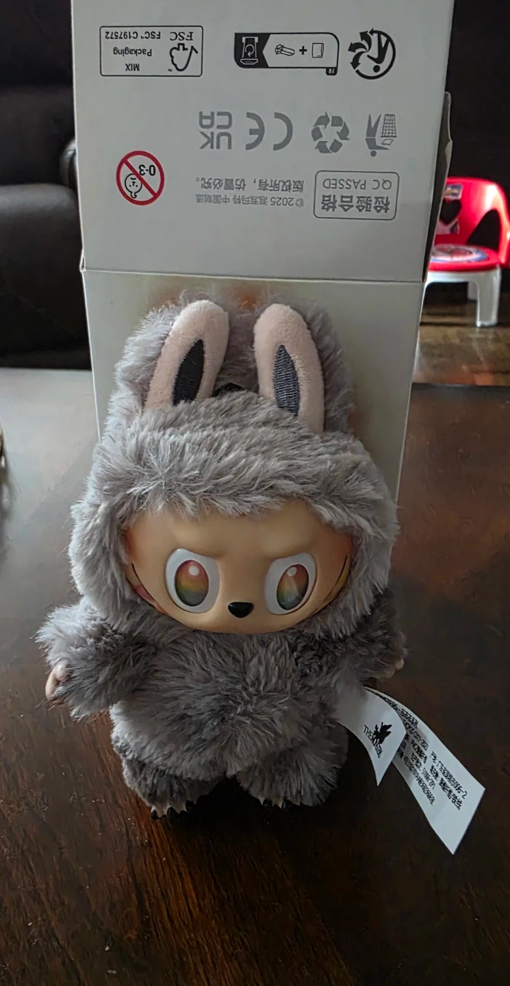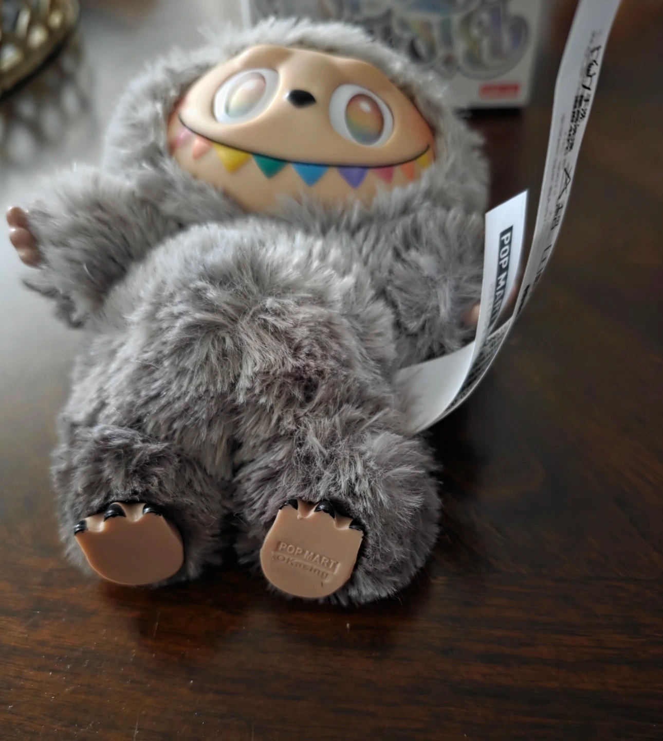 This is a POP MART blind box figure, featuring a fuzzy grey character with colourful rainbow teeth and big, expressive eyes. It's a fun collectible toy! The item comes with its original box.