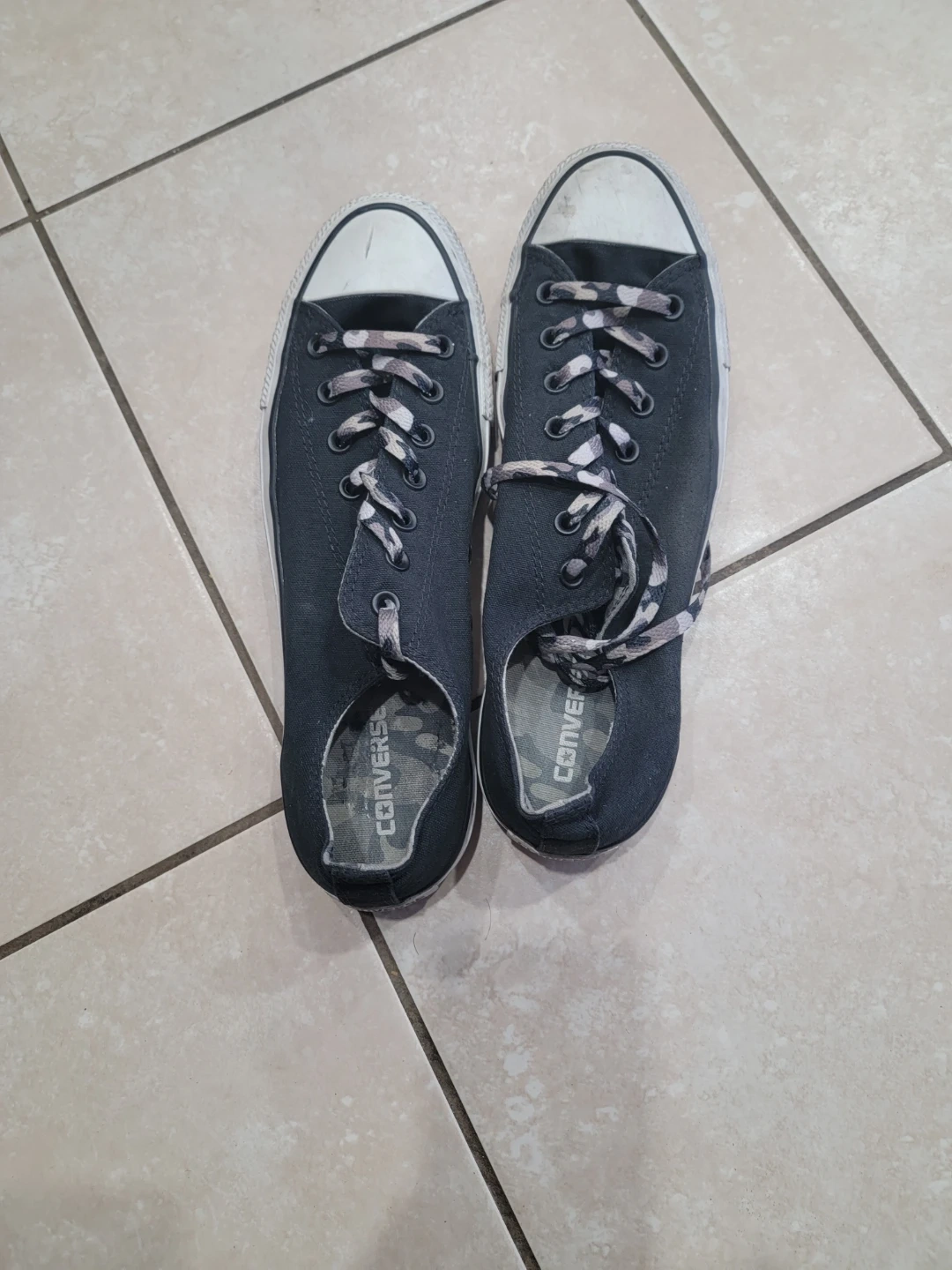 Classic Converse Chuck Taylor All Star shoes. They're black with a camouflage-patterned inner lining and sole. Lace-up closure.