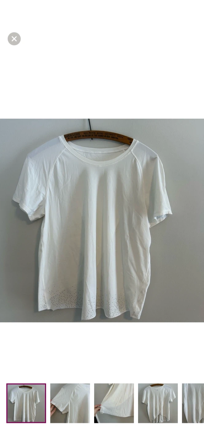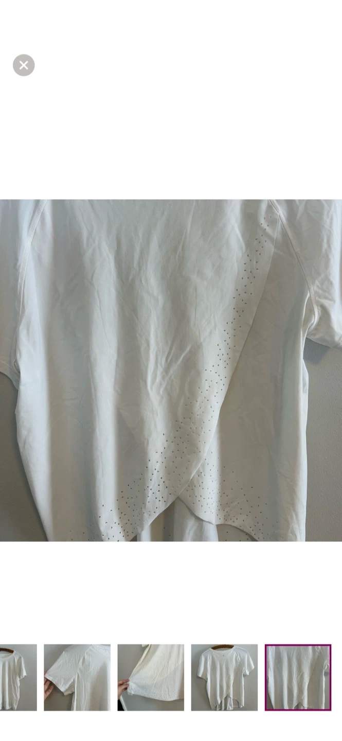 Lululemon brand. Short sleeve curved open back top. White with cutout hem. No size dot, fits like a medium. Pit to pit 17.5” but with open back could fit smaller/bigger. Brand new condition