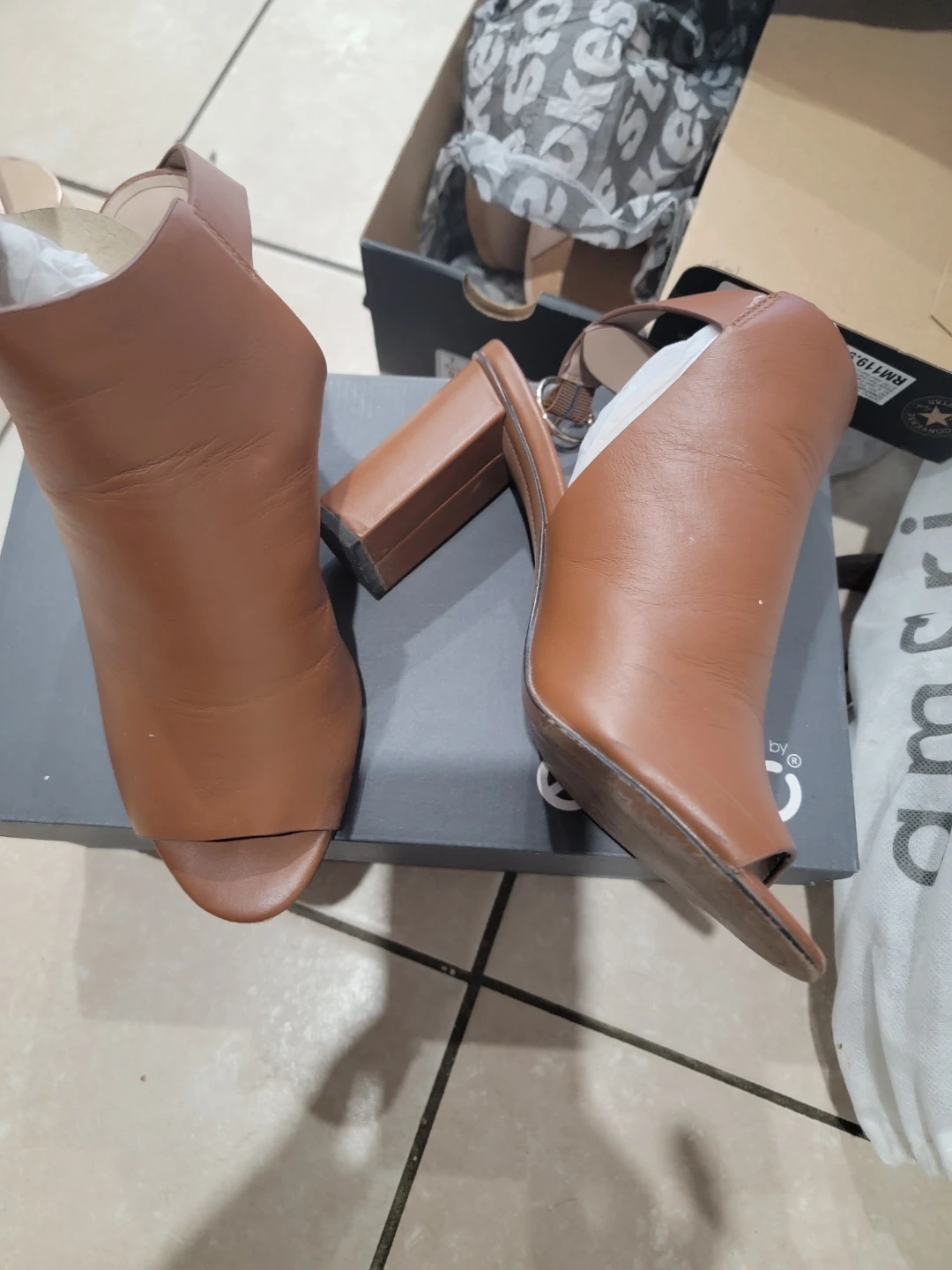 Stylish brown leather peep-toe heeled booties. These shoes feature a comfortable block heel and an open front design. They're perfect for dressing up any outfit!