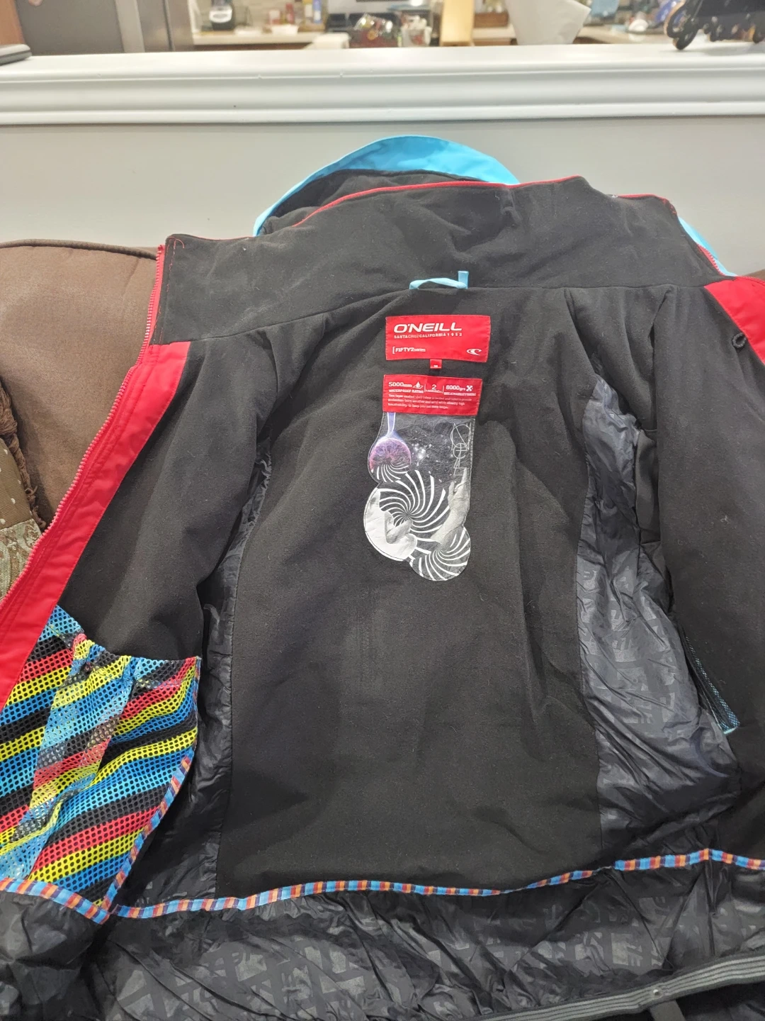 This is an O'Neill ski or snowboard jacket. It's a boys' or youth size, featuring a bright blue, red, and grey colour block design. It's designed for cold weather activities. This jacket offers good protection from the elements.