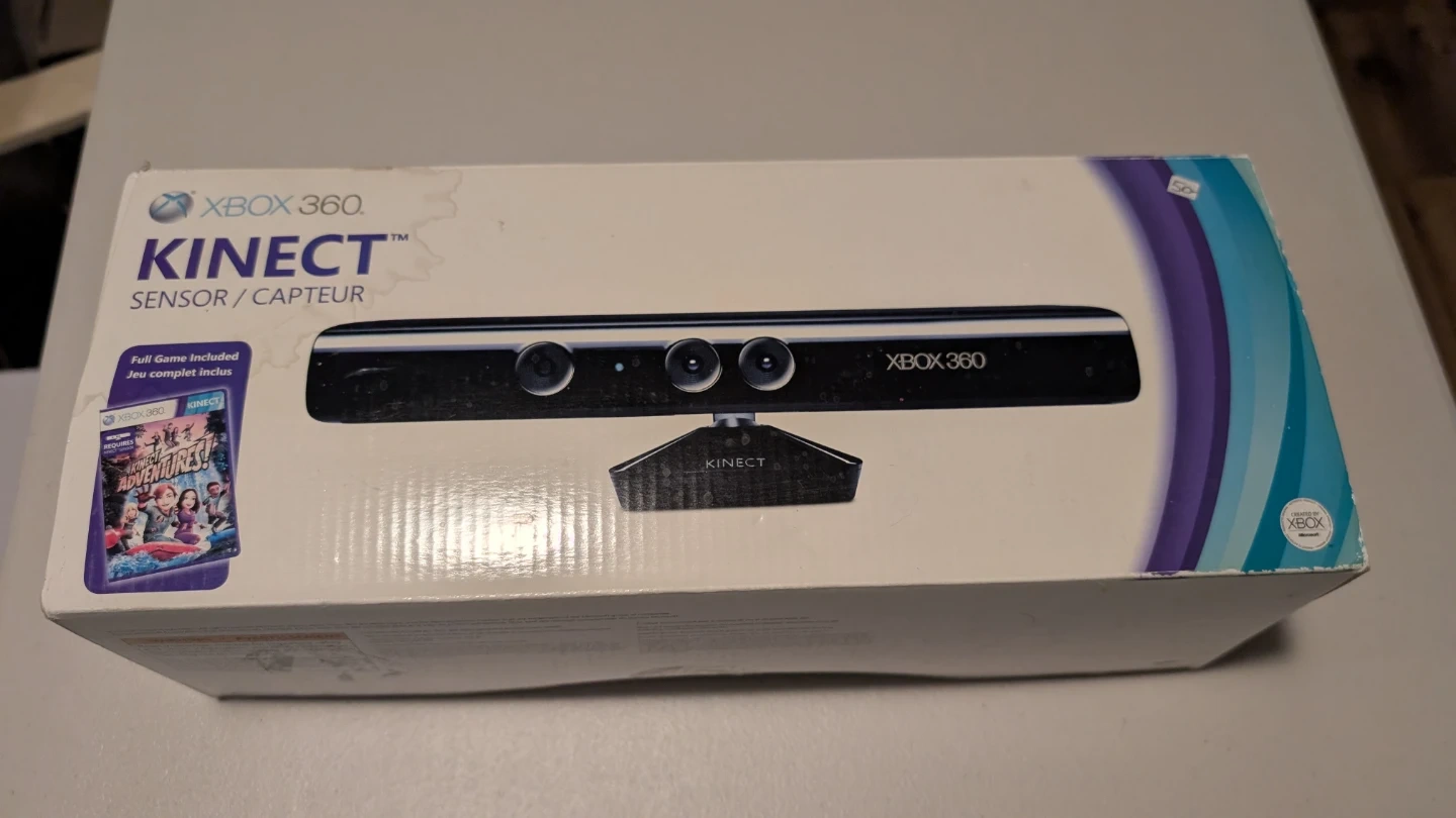 This is an Xbox 360 Kinect sensor with the Kinect Adventures game included. It comes with the sensor, the game, and the necessary cables and power adapter. It's in the original box.