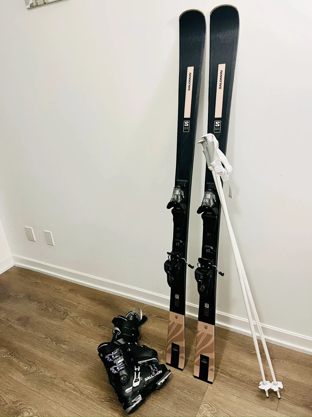 This is a Salomon ski set featuring black ski boots, black skis, and white ski poles. The skis have a pink accent stripe with the Salomon logo visible. It's ready for the slopes!