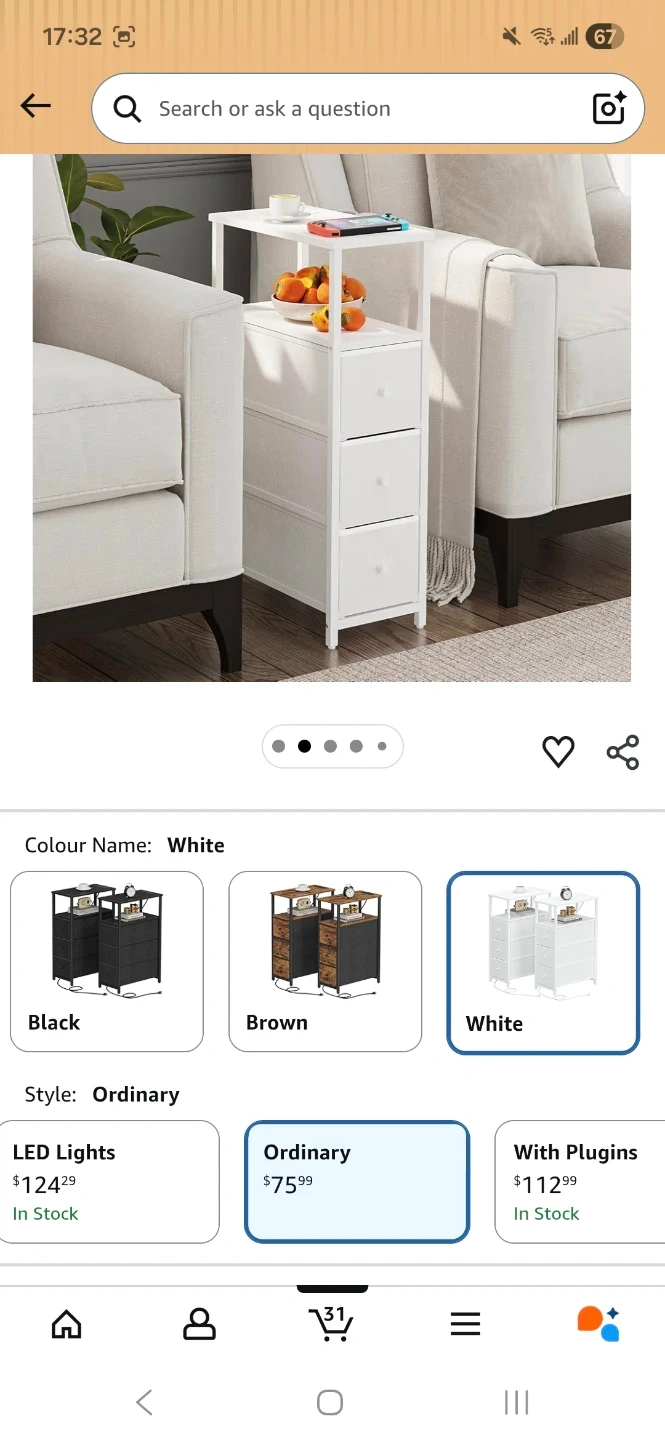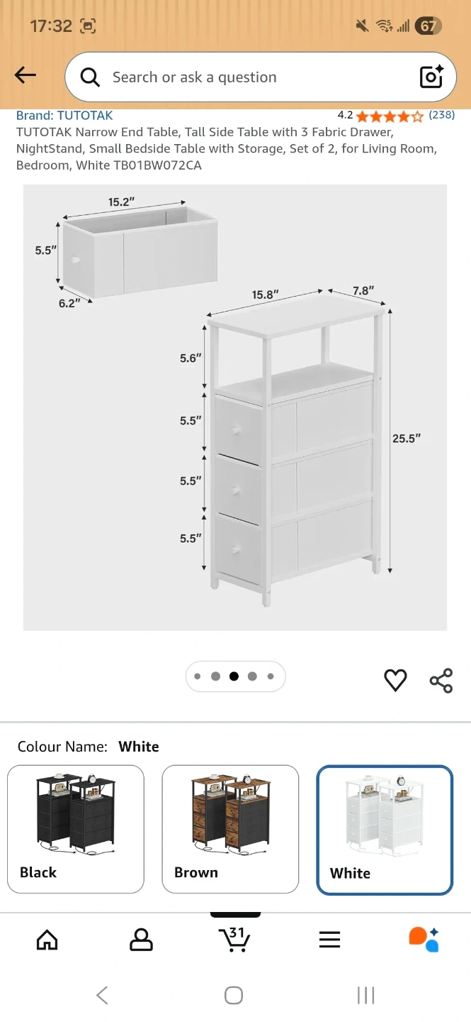 This TUTOTAK narrow end table is white and comes with three fabric drawers for storage. It's a tall side table designed for living rooms, bedroom or bathroom.