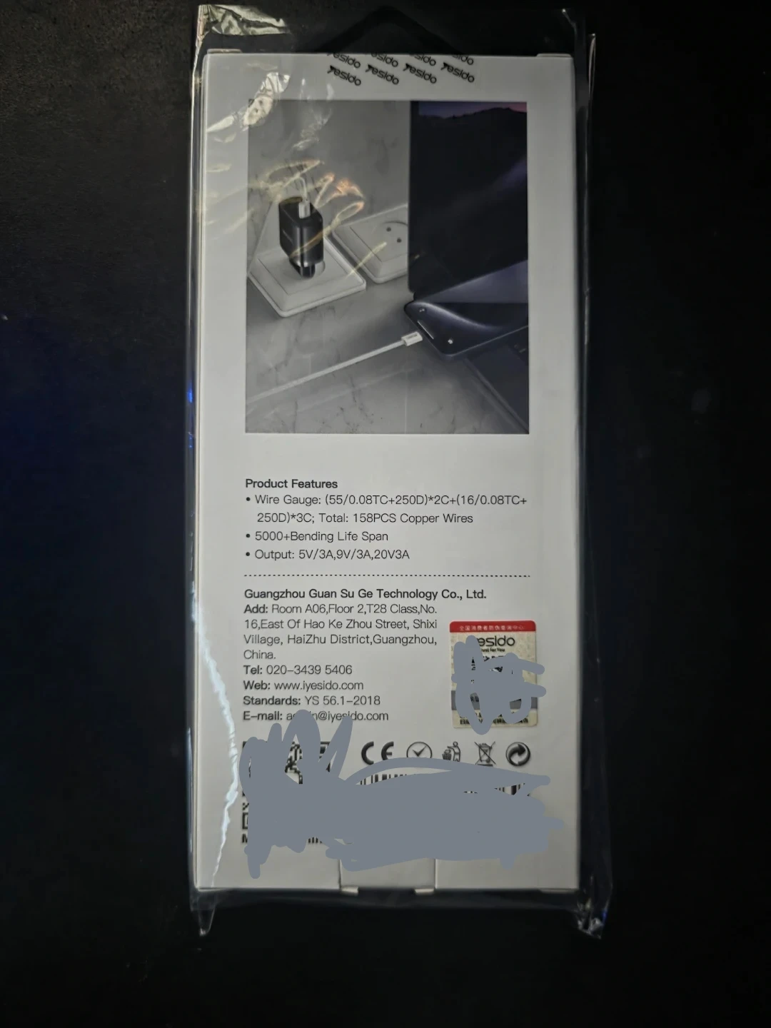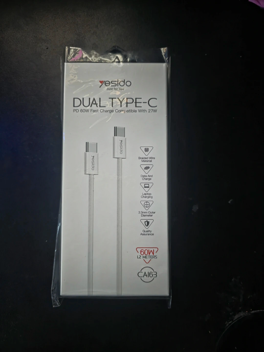This Yesido cable offers PD 60W fast charging, compatible with 27W devices. It features a braided wire material and supports data and charge functions. The cable is 2 meters long and has a 3.3mm outer diameter.