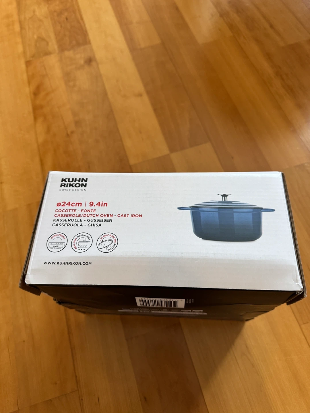 This is a Kuhn Rikon 24cm (9.4 inch) cast iron Dutch oven. It's blue and includes the lid. Oven safe up to 450F.