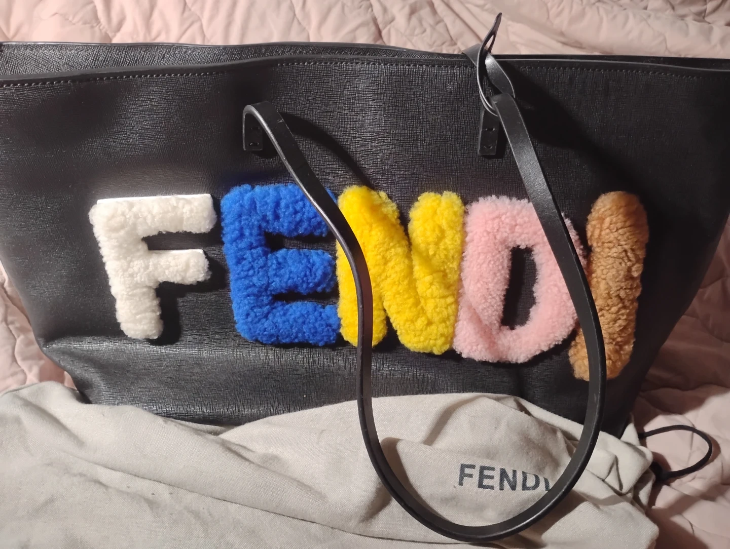 This is a Fendi shearling large tote bag with fluffy letters. It's made in Italy. This bag is perfect for carrying your everyday essentials!