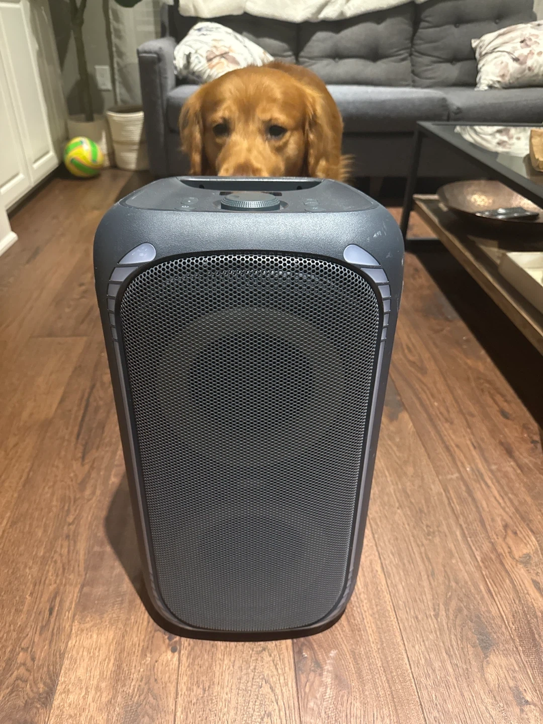 This Onn. portable speaker delivers great sound on the go. It features a built-in handle and wheels for easy transport. Perfect for outdoor gatherings or parties!