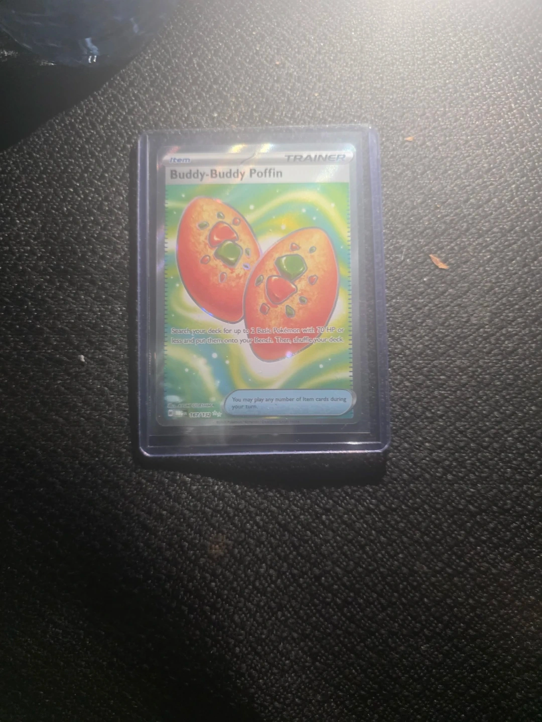 This is a Buddy-Buddy Poffin Trainer card from the Pokemon Trading Card Game. It allows you to search your deck for up to 2 Basic Pokémon with 70 HP or less and put them onto your Bench, then shuffle your deck. You may play any number of item cards during your turn.