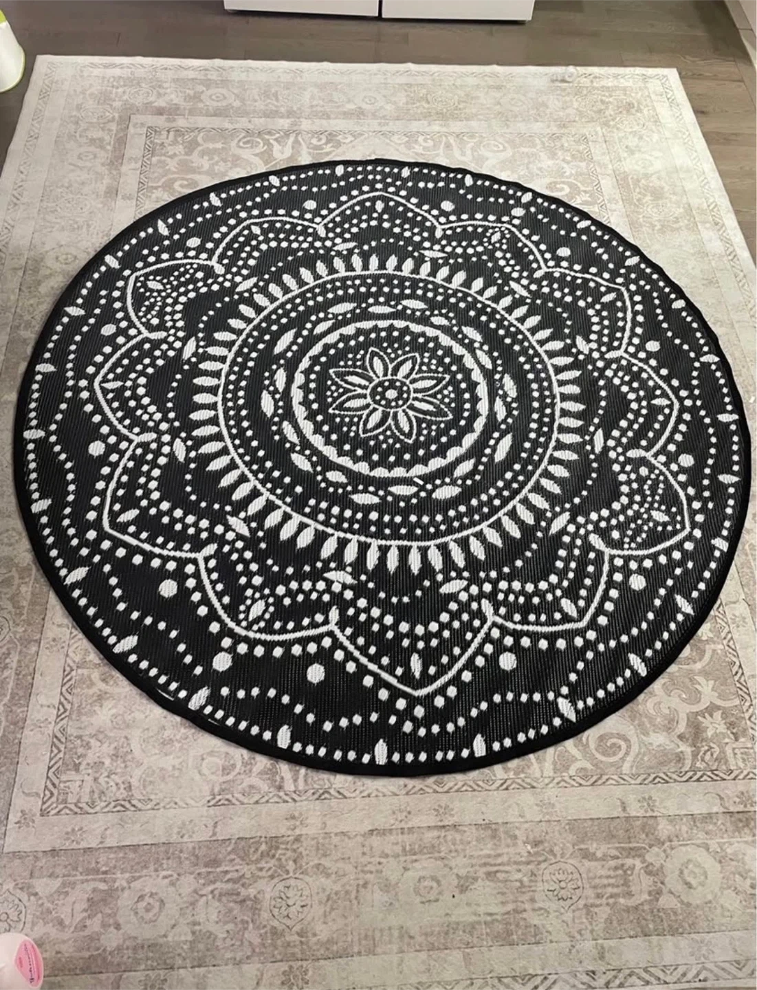This reversible round area rug features a striking black and white mandala pattern. It's made from durable material that's easy to clean. Perfect for adding a bohemian touch to any room!