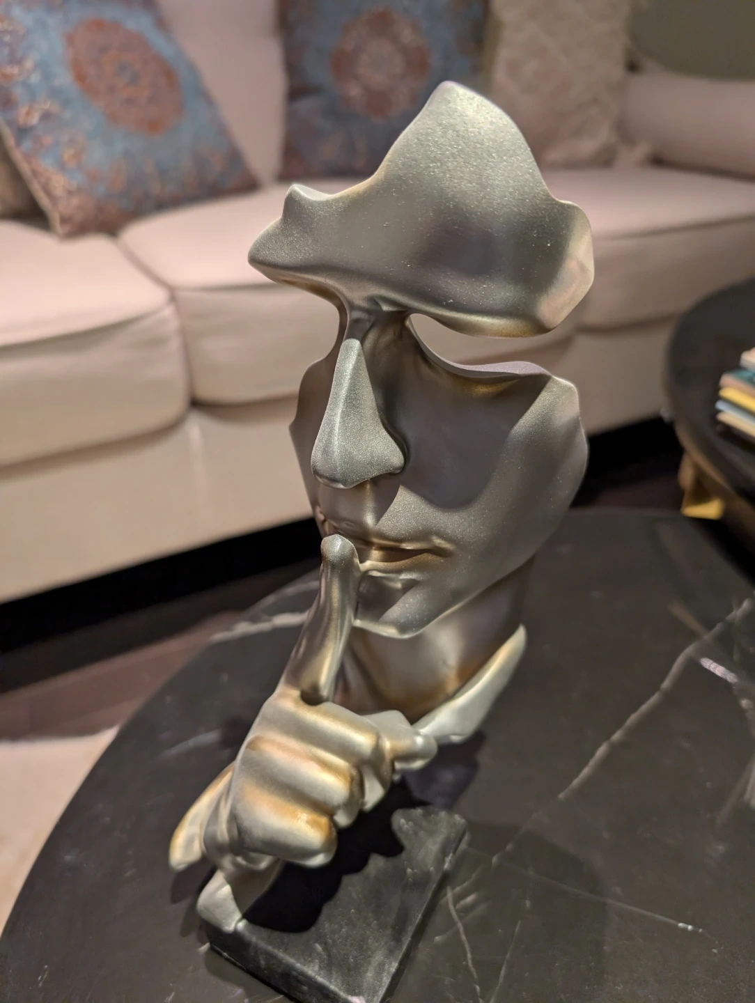 This abstract sculpture depicts a thinker. It's made of a metallic silver material with a slight golden sheen. Perfect for adding a unique touch to your home decor!