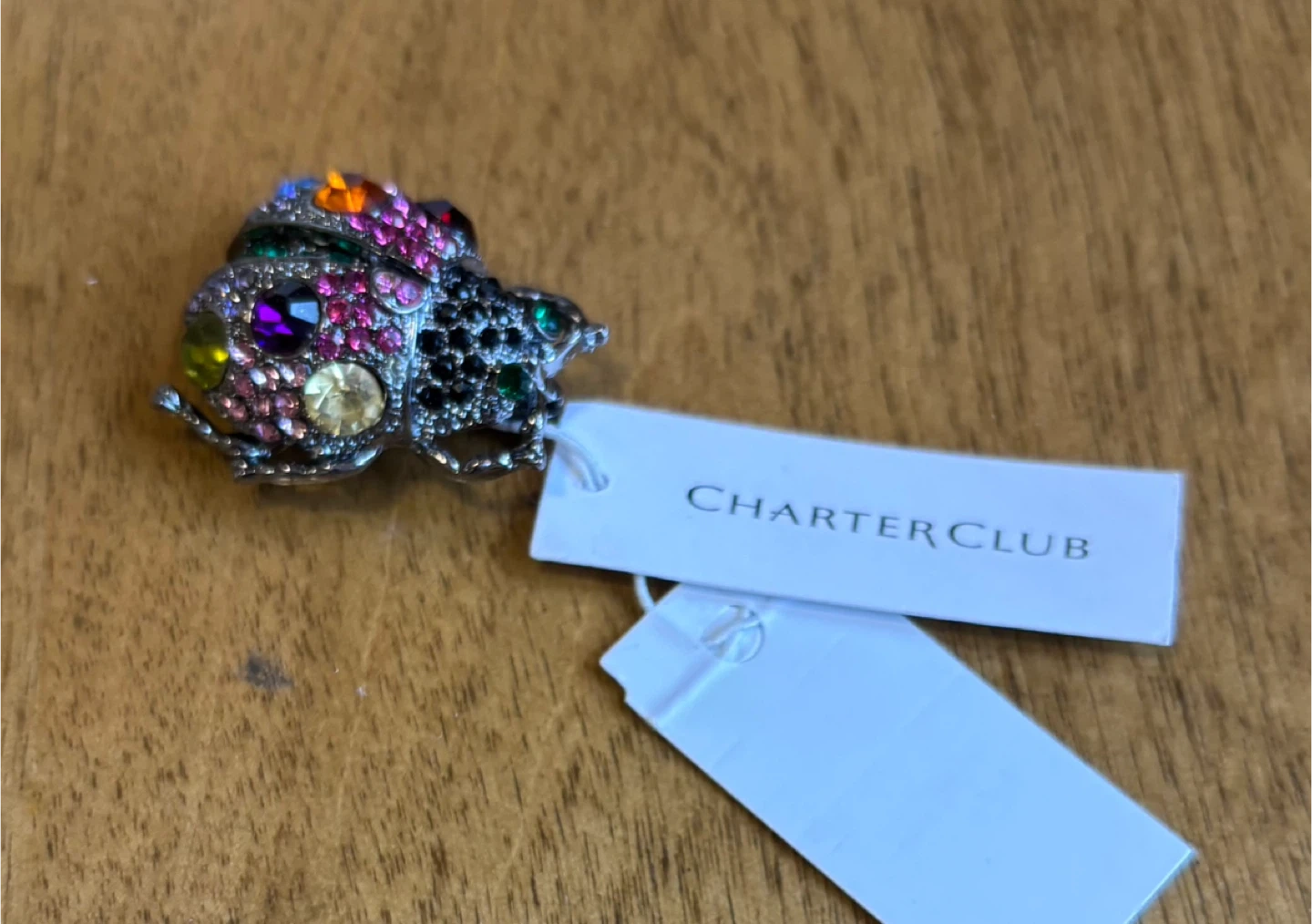 A whimsical ladybug brooch from Charter Club. It's adorned with colorful rhinestones. This piece adds a playful touch to any outfit!