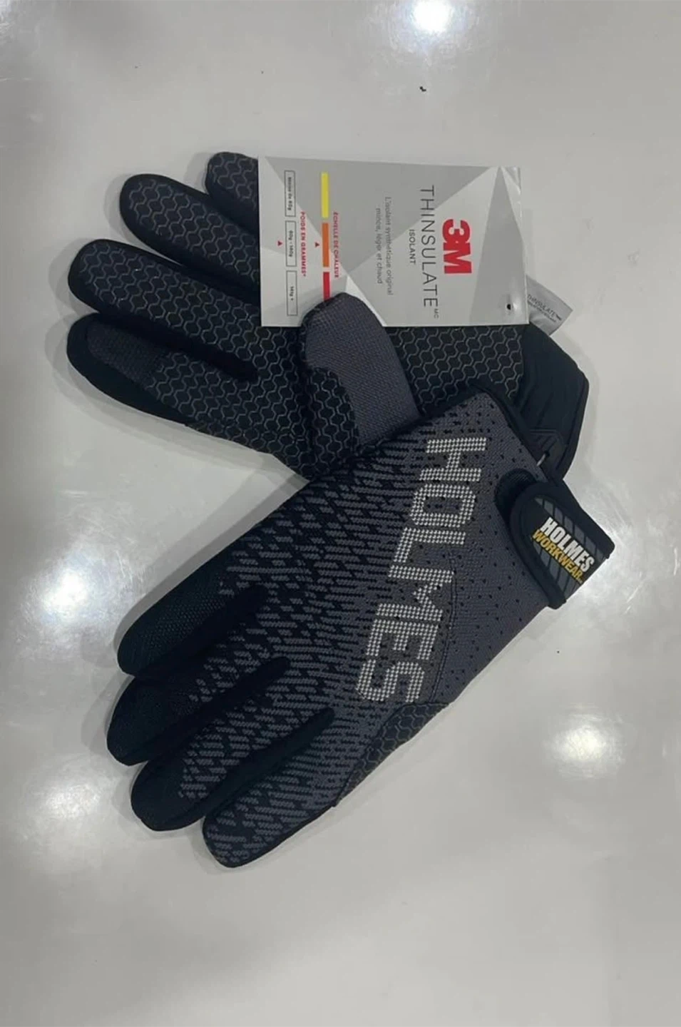 Holmes Workwear winter gloves, featuring 3M Thinsulate insulation for warmth. They're designed to be thin and light, making them comfortable for various tasks. The grip pattern on the palms and fingers helps with handling objects. This is a pair of work gloves.
