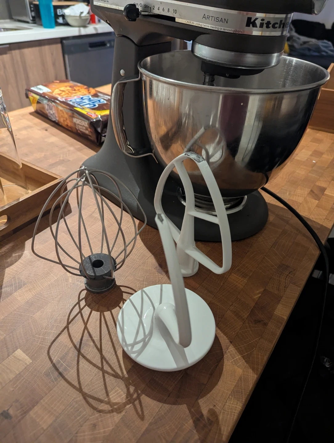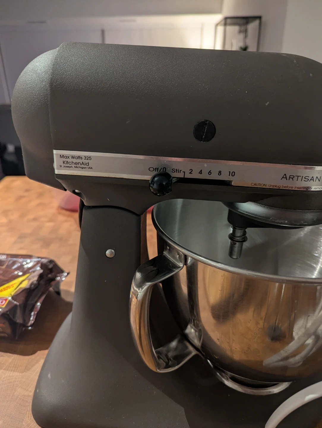 This is a matte grey KitchenAid Artisan stand mixer. It comes with a wire whisk and a flat beater attachment. It features 10 speed settings and has a max wattage of 325. This mixer is great for all your baking needs!