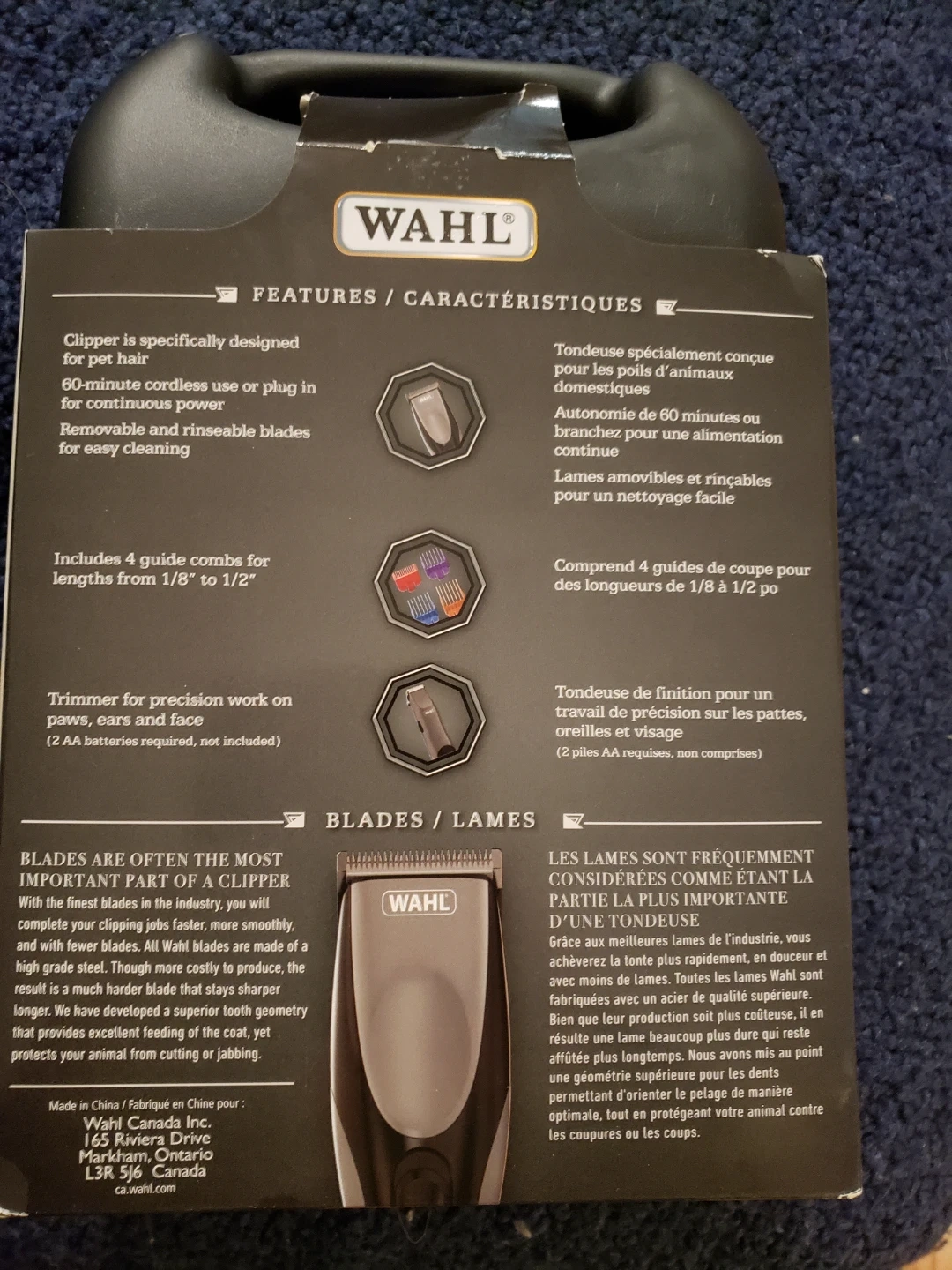 Used only once. Didn't work on a cat. This Wahl Pro Groom combo kit is designed for pet hair grooming. It's cord/cordless and offers 60-minute use on a single charge. Includes removable and rinseable blades for easy cleaning, along with 4 guide combs ranging from 1/8" to 1/2". A trimmer for precision work on paws, ears, and faces is also included.