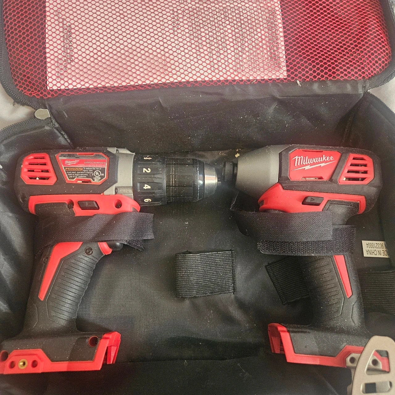 Includes a Milwaukee M12 FUEL cordless drill and impact driver. Both are red and black. Comes in a red carrying case with a black interior. With battery's and charger