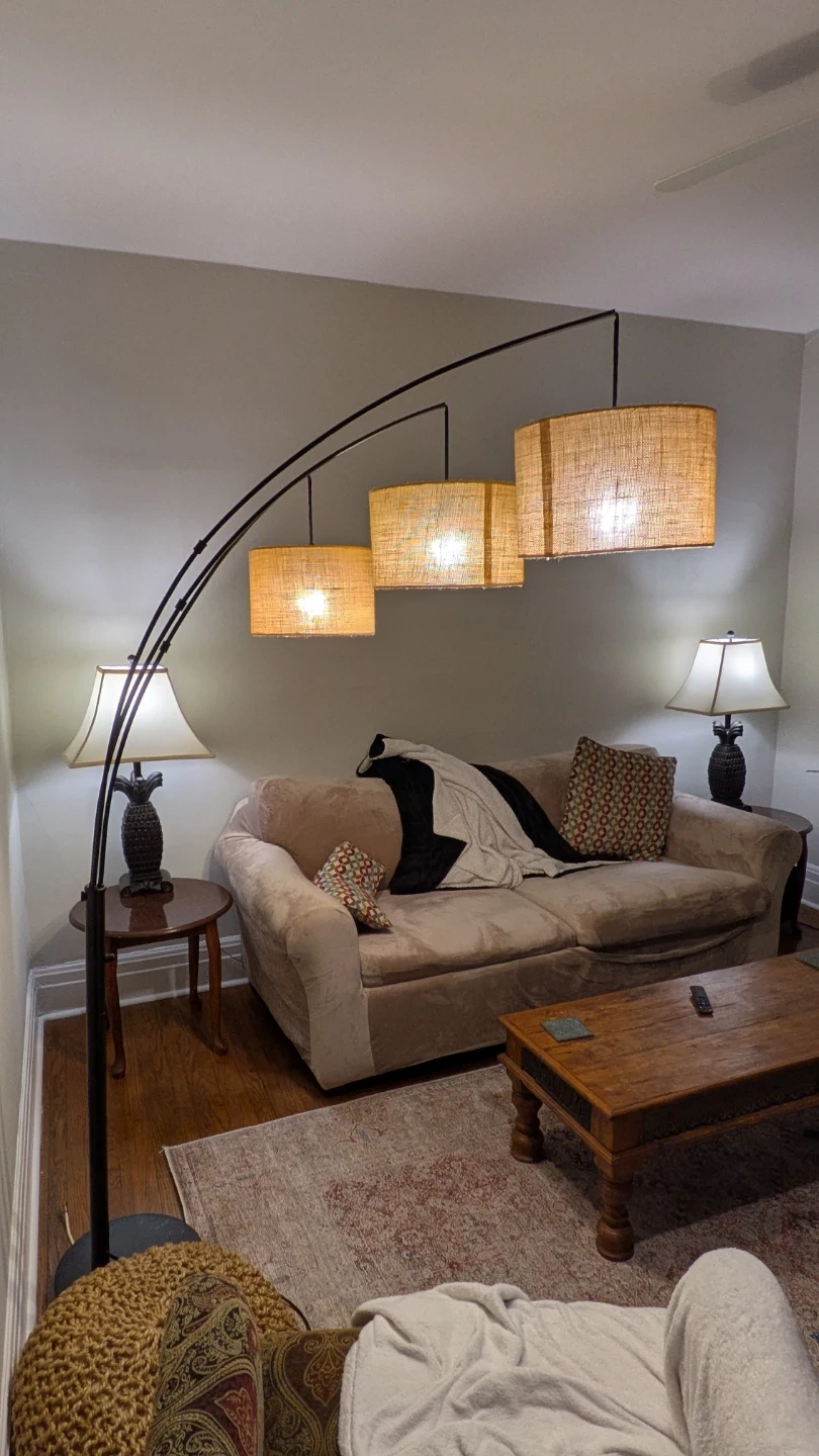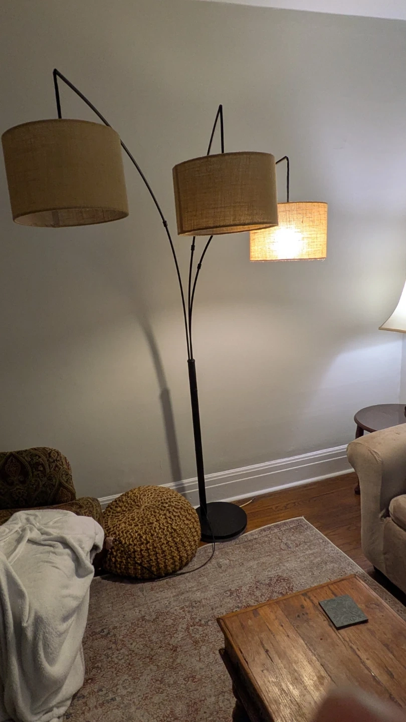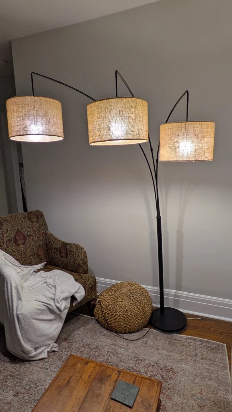 This arc floor lamp has three drum-shaped fabric shades. The shades are a natural beige colour. It's a great way to add ambient lighting to your living space.