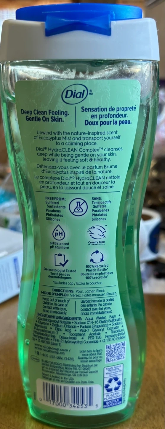 This Dial body wash features a Eucalyptus Mist scent to help you relax. It's formulated with Hydraclean Complex to cleanse gently. Dermatologist tested and pH balanced.