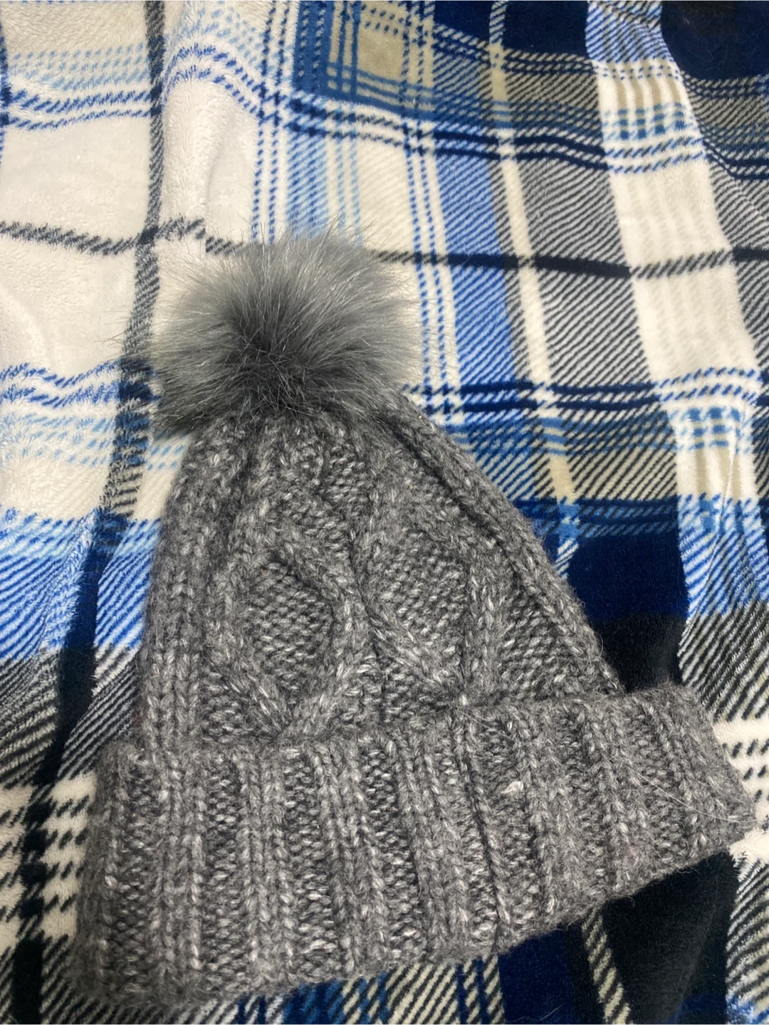 Cozy knit hat with a fluffy grey pom pom. Ribbed cuff for a snug fit. It's a great accessory for staying warm on chilly days! Pick up cash only