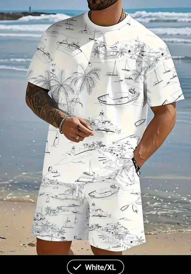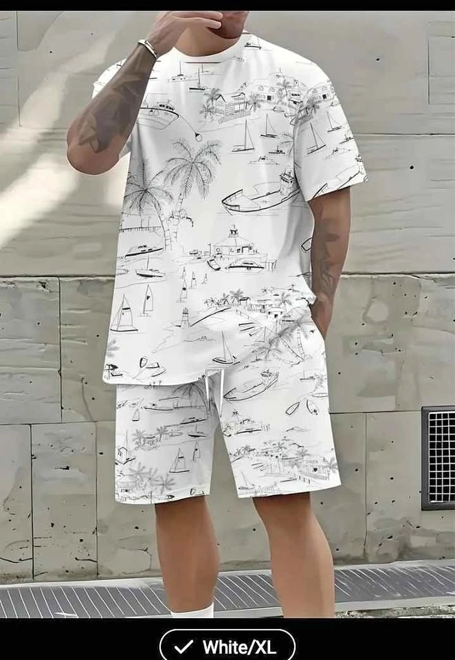 Men's fashion casual 3D print short sleeve shirt and shorts set. Features a round neck, regular fit, 100% polyester knit fabric with slight stretch. Located near Lakeshore and Thirteenth Street.