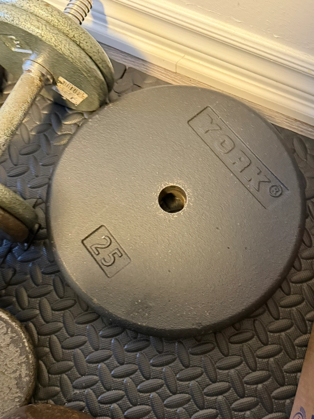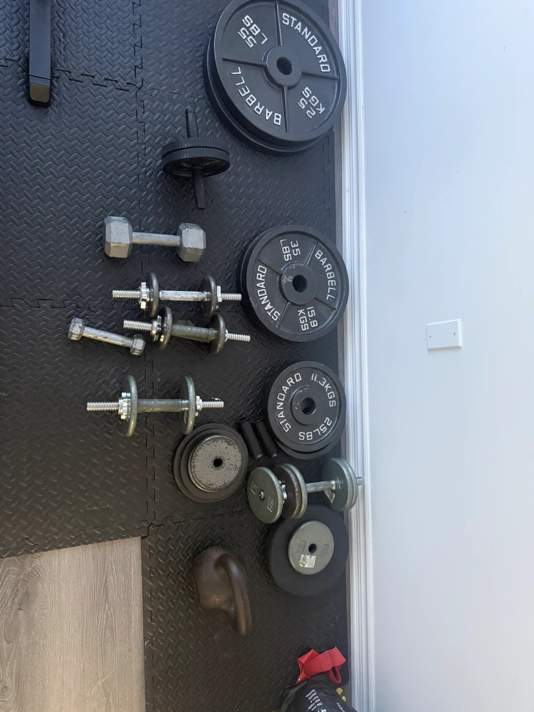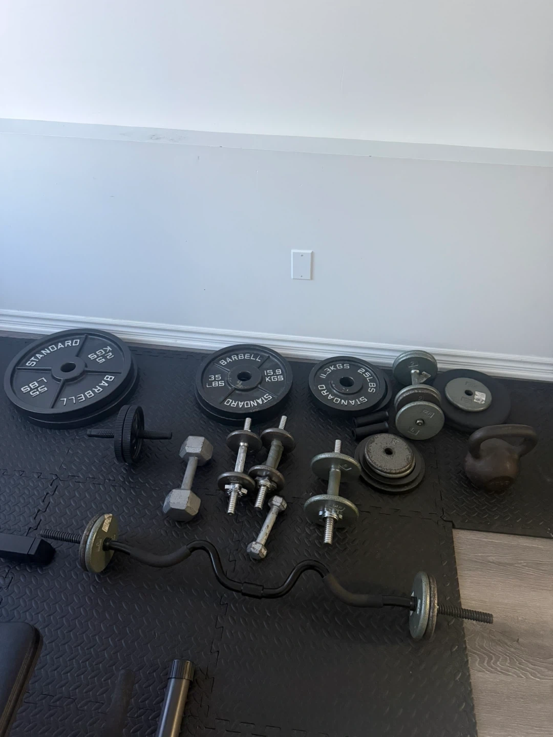Complete home gym setup including a power rack with bench, assorted standard weight plates and dumbbells, a curl bar, and a kettlebell. This collection offers a versatile range of equipment for strength training workouts. Great for building your own fitness space at home!