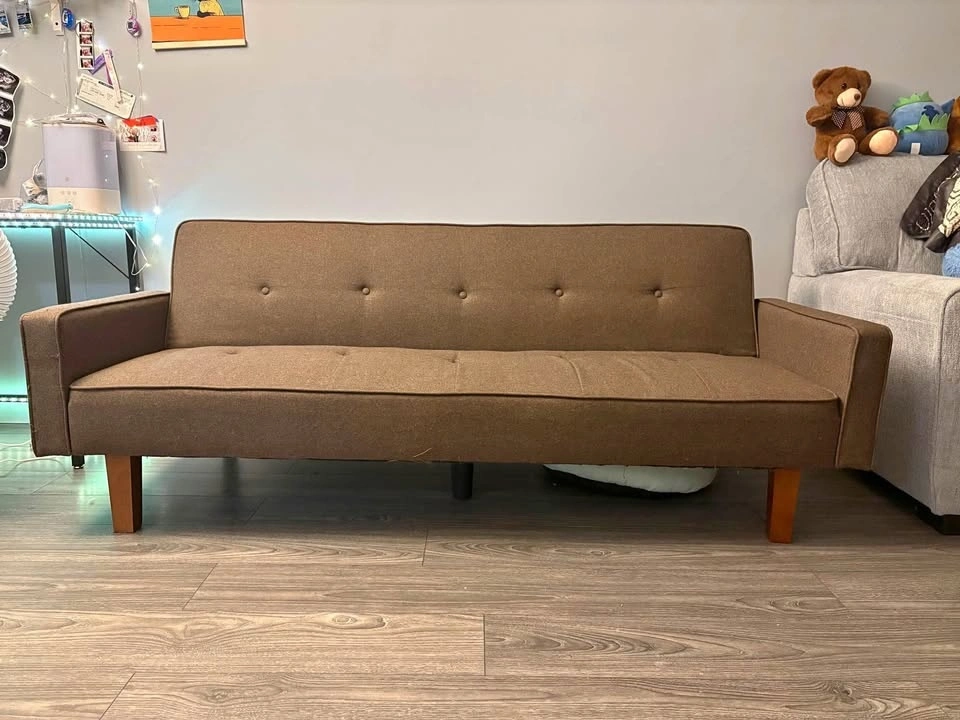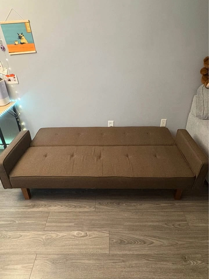 Selling a brown couch that reclines into 3 positions (sofa, 45 degrees, and flat bed). In good condition, it was always used with a cover. It does have some small scratches from cats, but no big defects or tears. Dimensions: Length 74 inches, Height 27 inches, Width 32.5 inches (couch) and about 38 inches (reclined). Pick up only, will need assistance to carry it out.