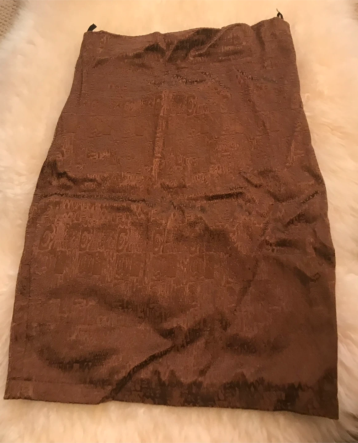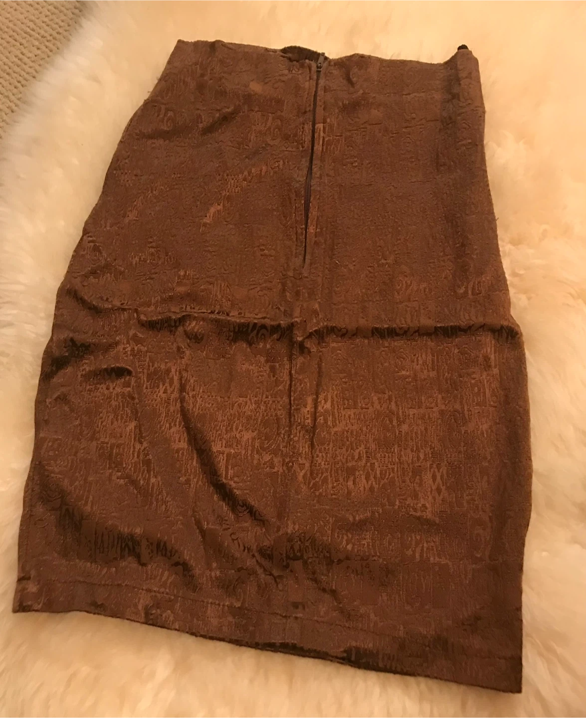 This is a brown mini skirt with a textured pattern. It features a back zipper closure. Made of a satiny material.