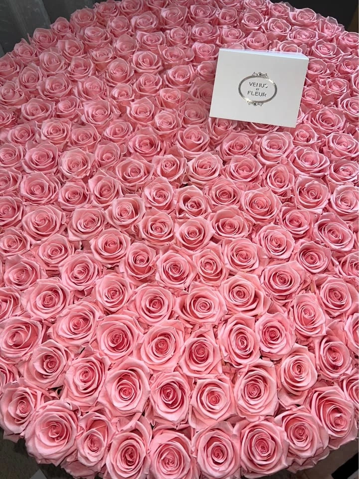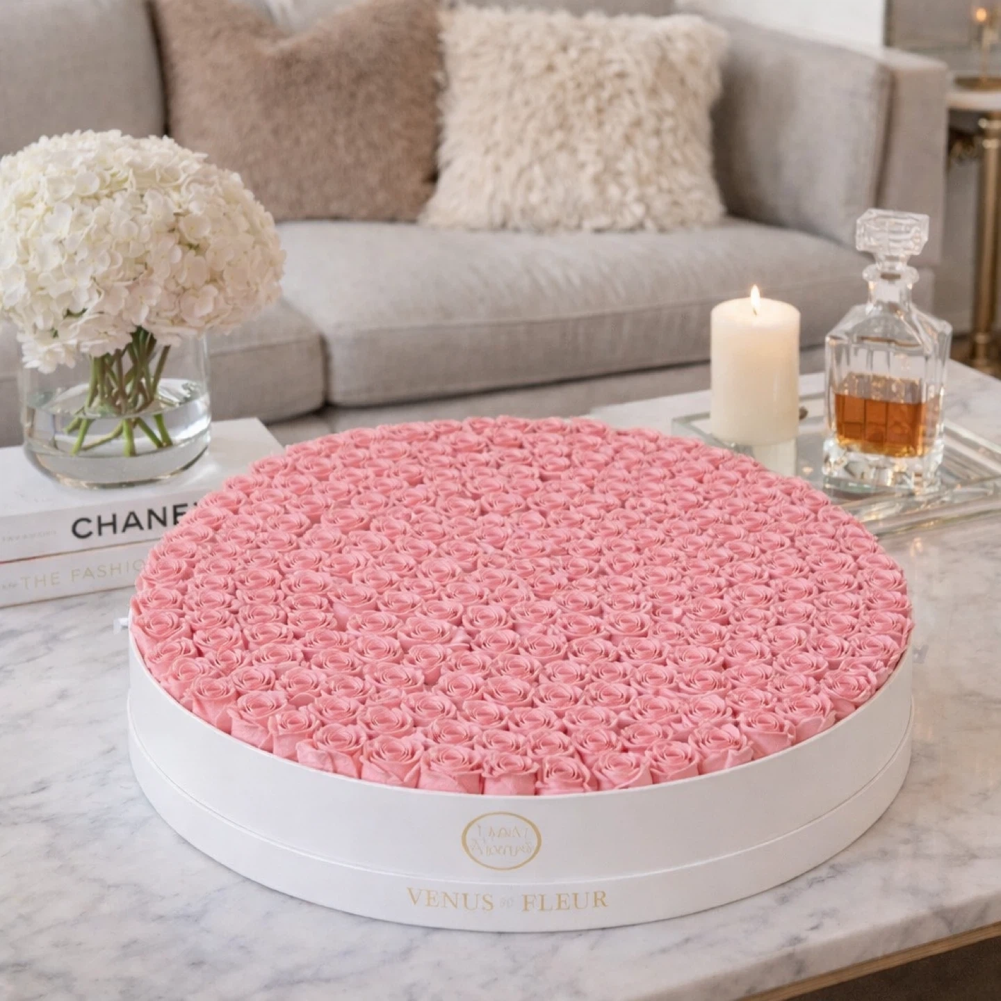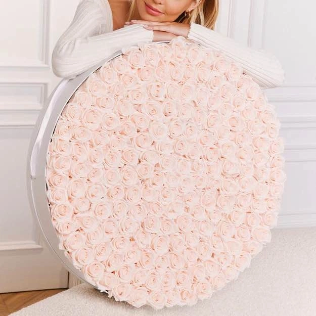 Gorgeous Venus et Fleur Round Grandiose arrangement featuring 255 real preserved Eternity roses in a large round Parisian-inspired white hat box. Handmade by in-house designers.