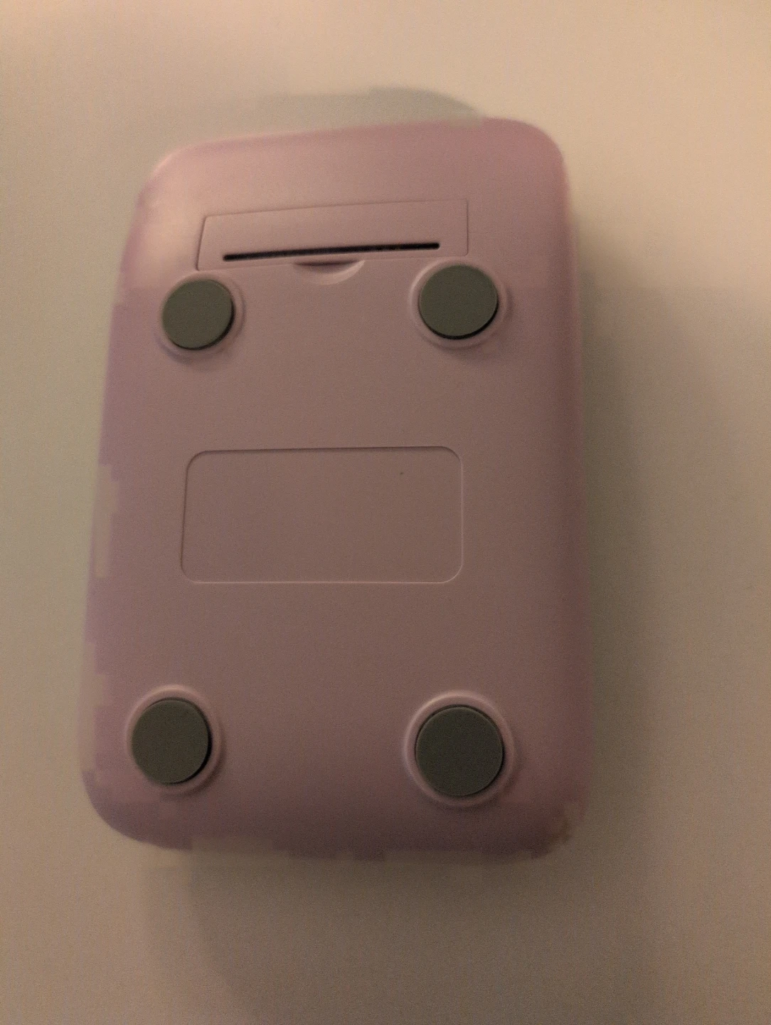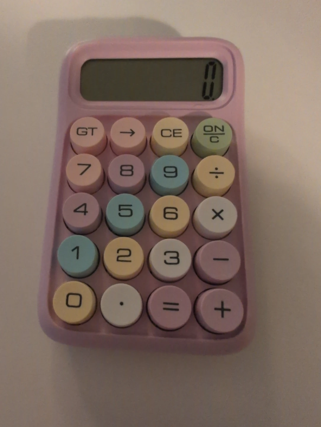 A cute pastel pink calculator with candy-style buttons. It displays numbers clearly on its screen. It's powered by batteries and has four rubber feet to keep it steady.