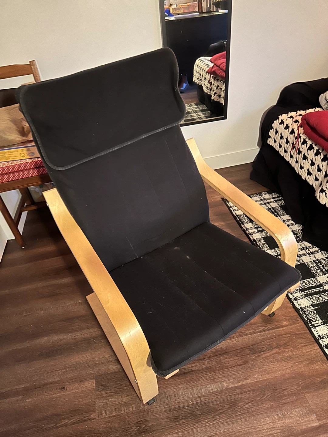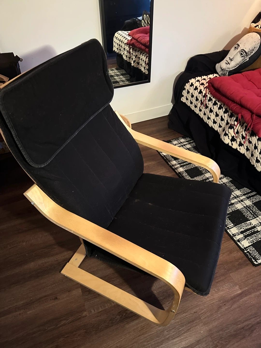 This is an IKEA Poäng armchair with a black frame and a bright red upholstered cushion. It's a classic, comfortable chair. The bentwood frame is a light wood colour and the cushion is tufted.