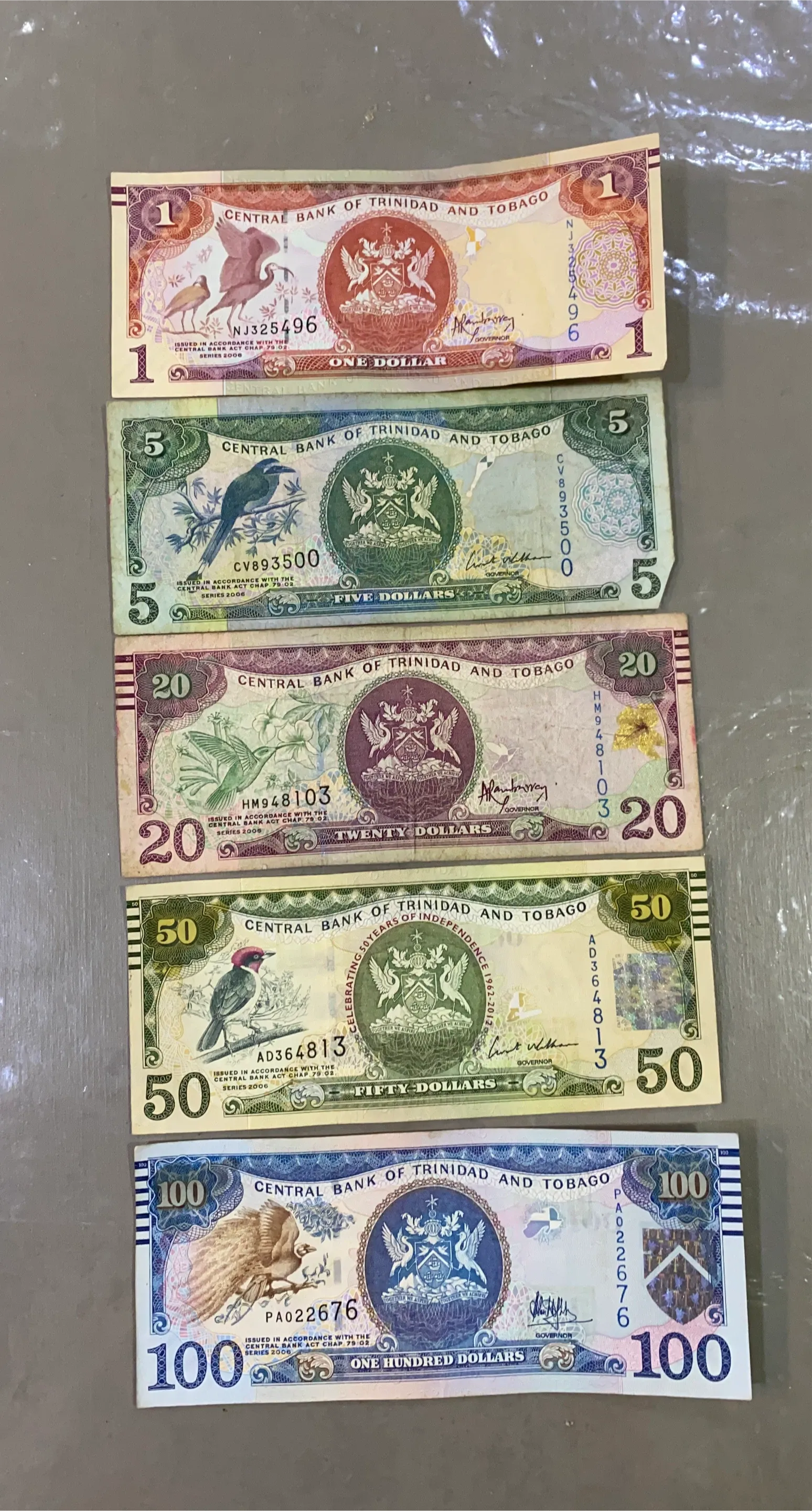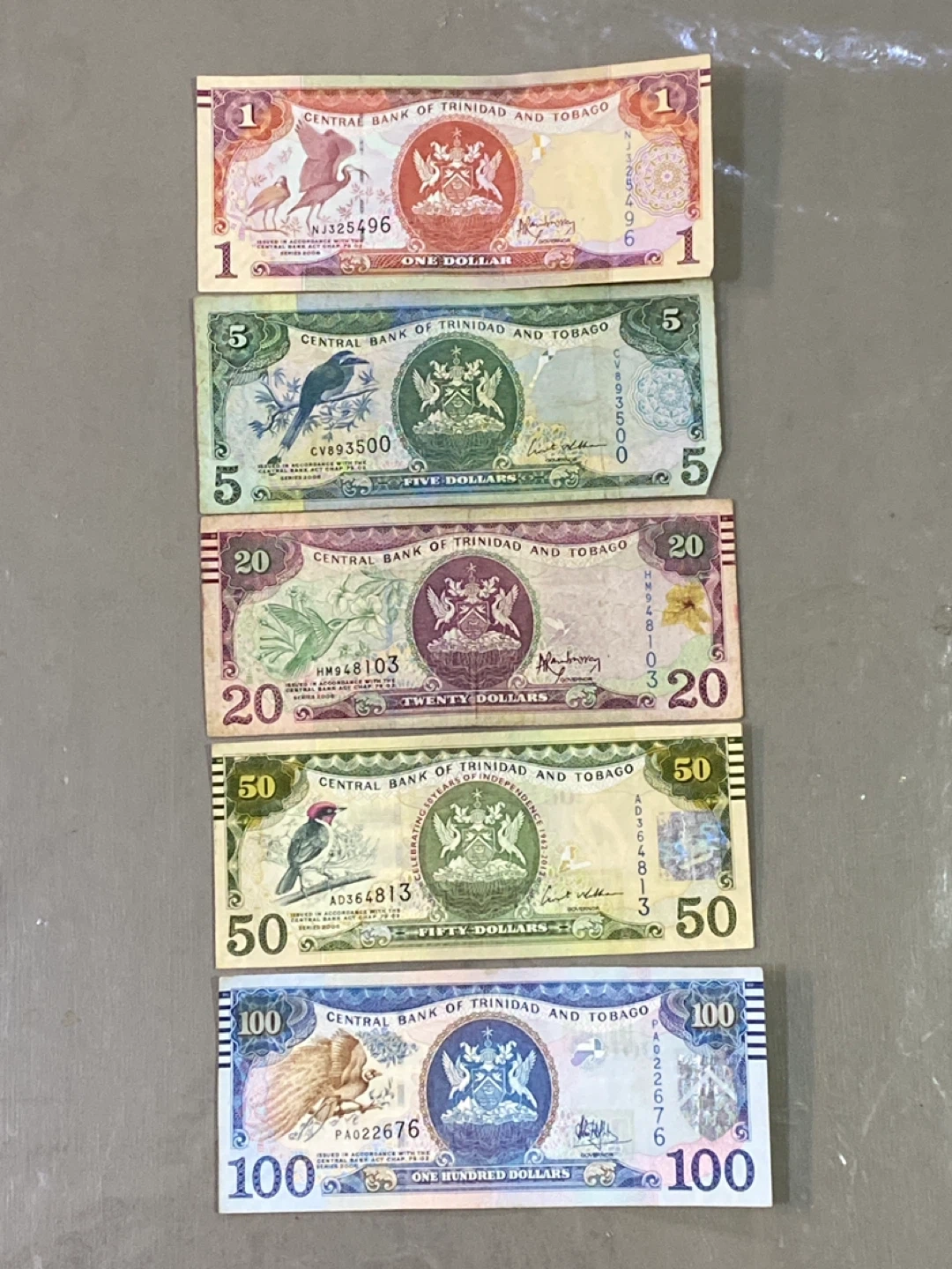 This listing includes a collection of banknotes from the Central Bank of Trinidad and Tobago. Denominations are one dollar, five dollars, twenty dollars, fifty dollars, and one hundred dollars. These are official currency notes.