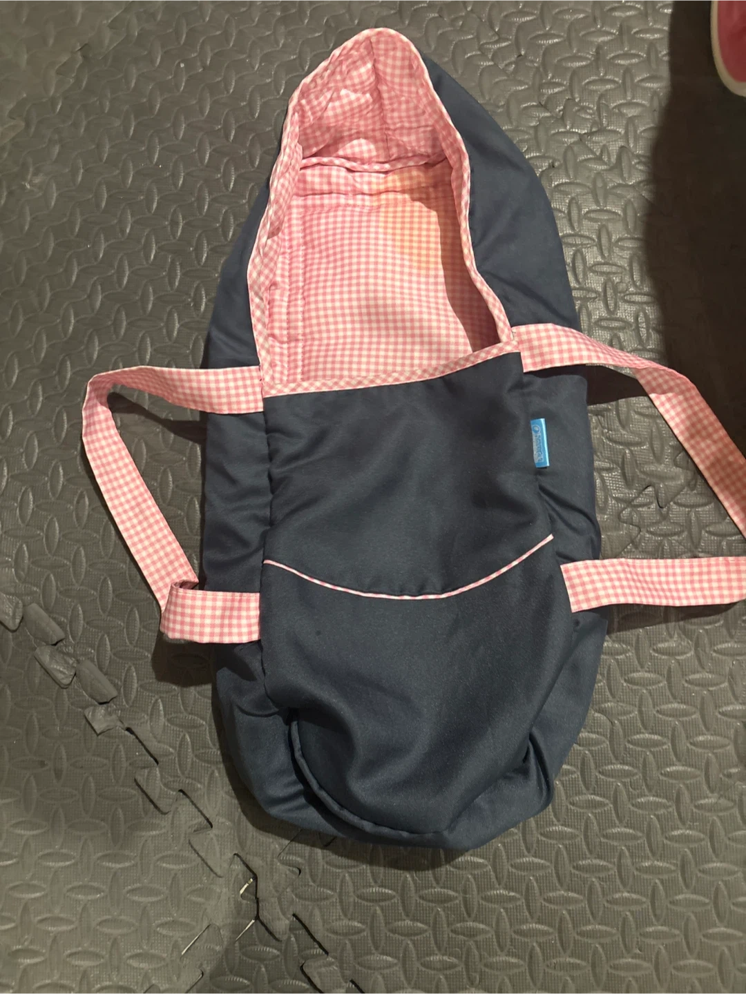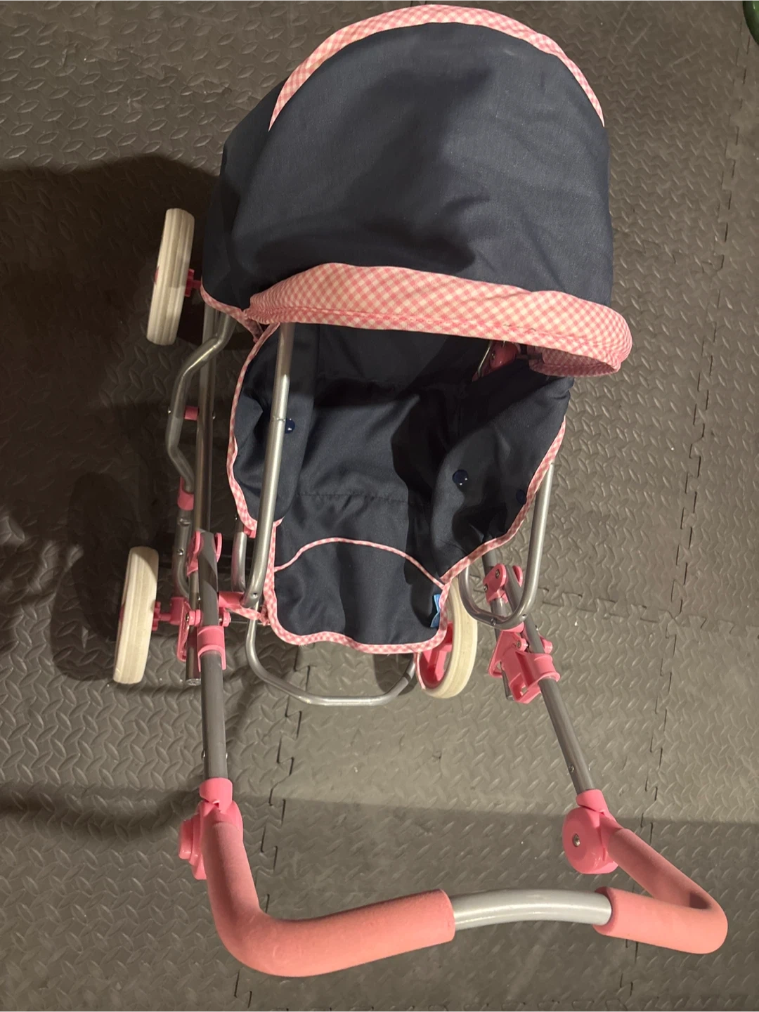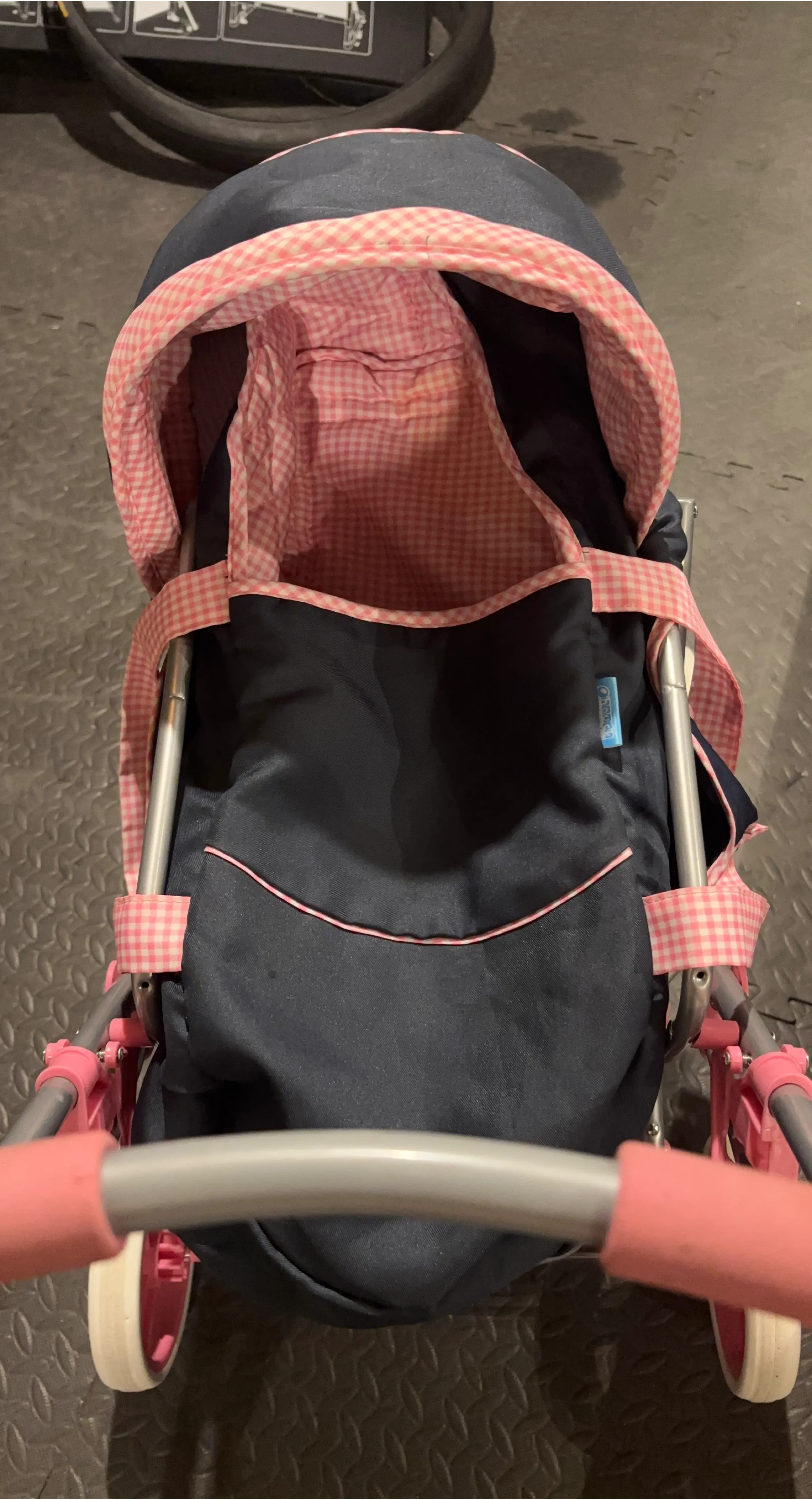 This is a doll stroller with navy blue fabric and pink gingham accents. It has a silver-toned frame and pink handles. It's a fun accessory for imaginative play. Comes with baby carrier.