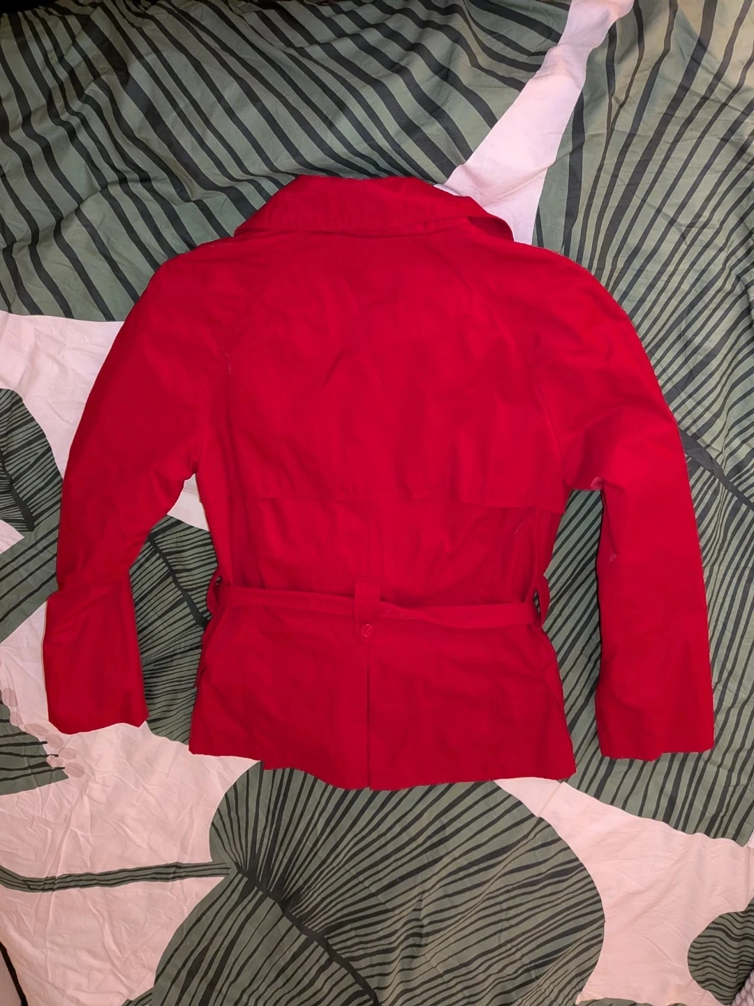 This red Twik jacket is a stylish double-breasted trench coat. It's made with a cotton blend and features a removable belt. It's a size M from Simon's