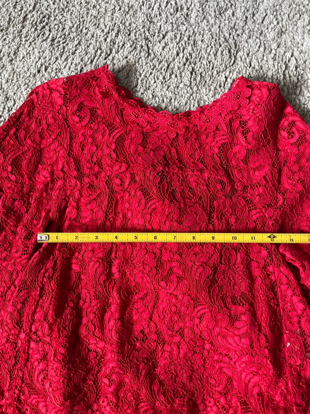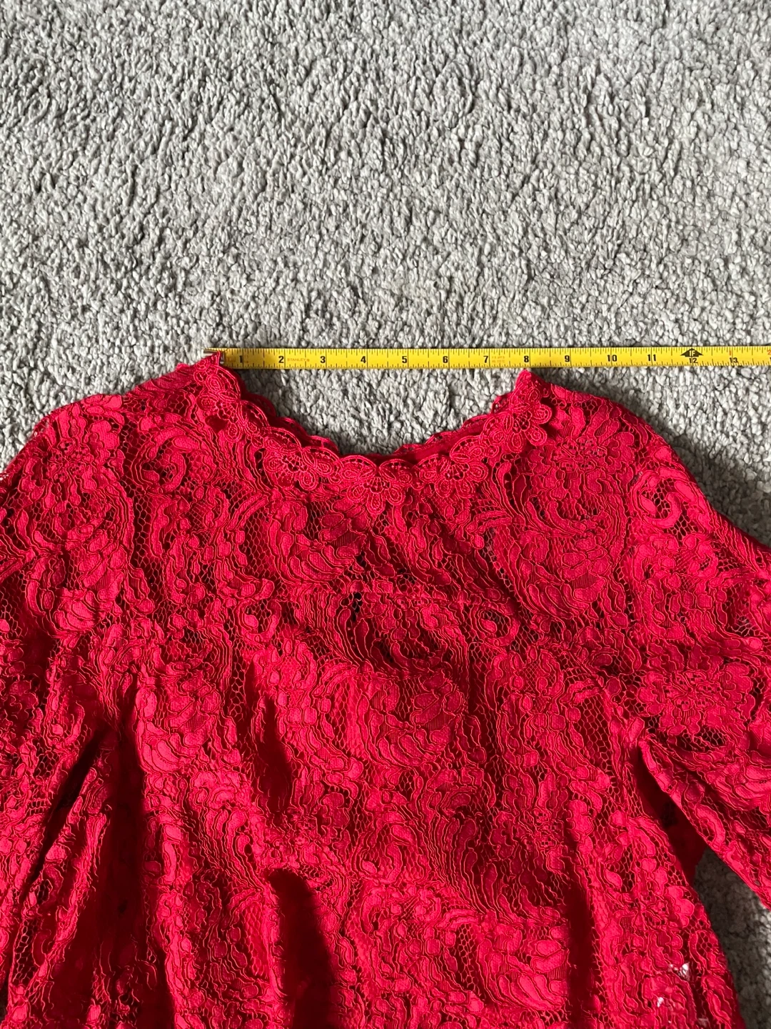 This is a red lace top with bell sleeves and a scalloped hem. It comes with a matching red camisole. The top has intricate floral lace detailing throughout. It's a stylish piece for a night out!