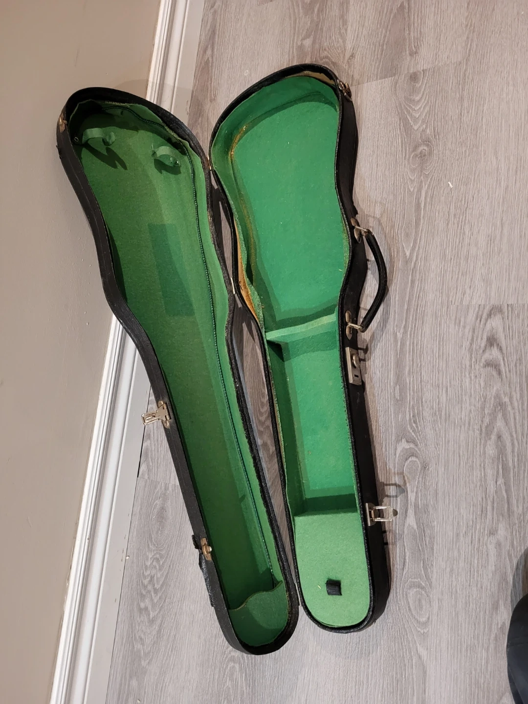 A black violin case with green interior lining. It has a handle and two latches for closure. Some wear and tear visible on the exterior.