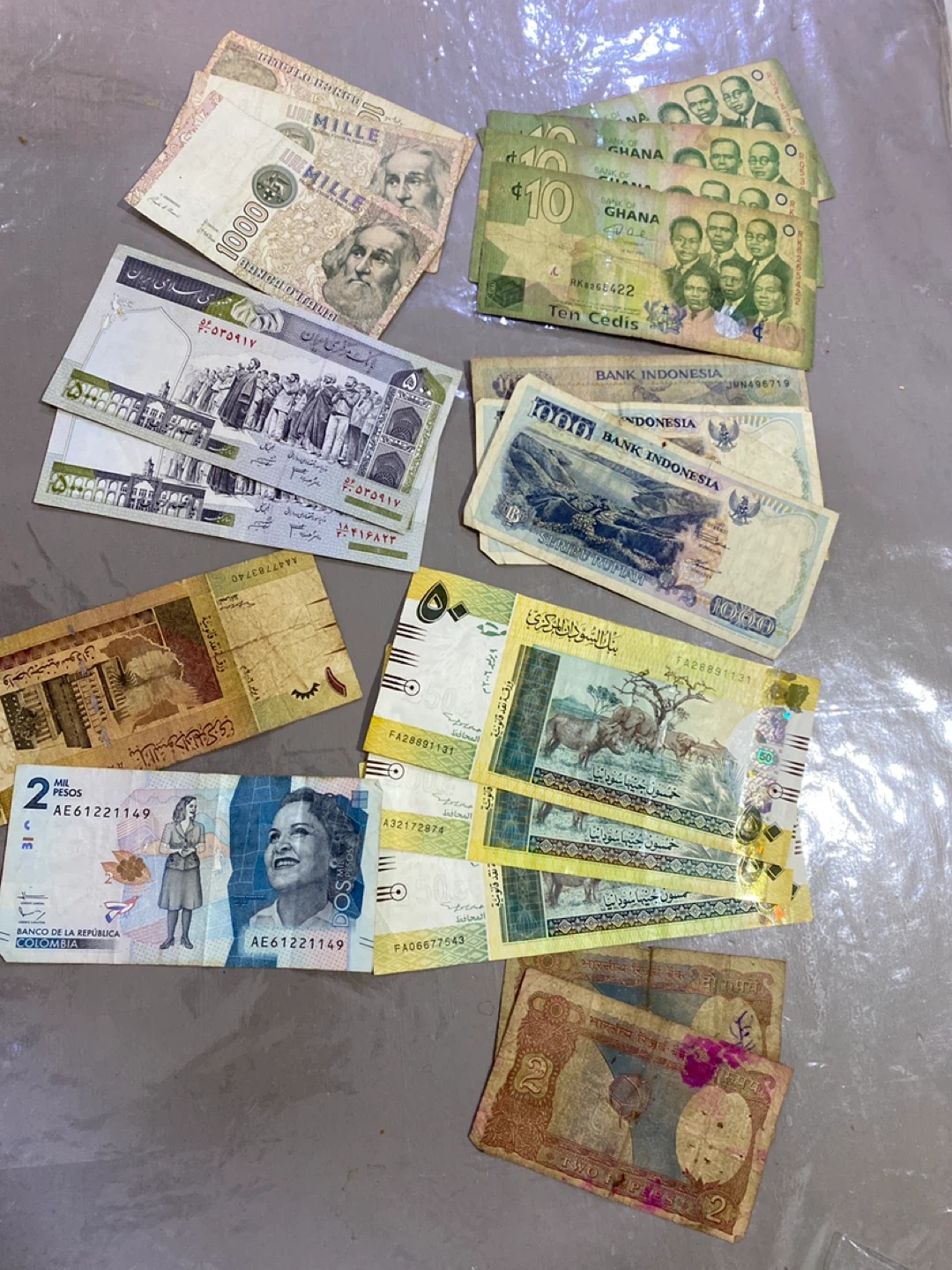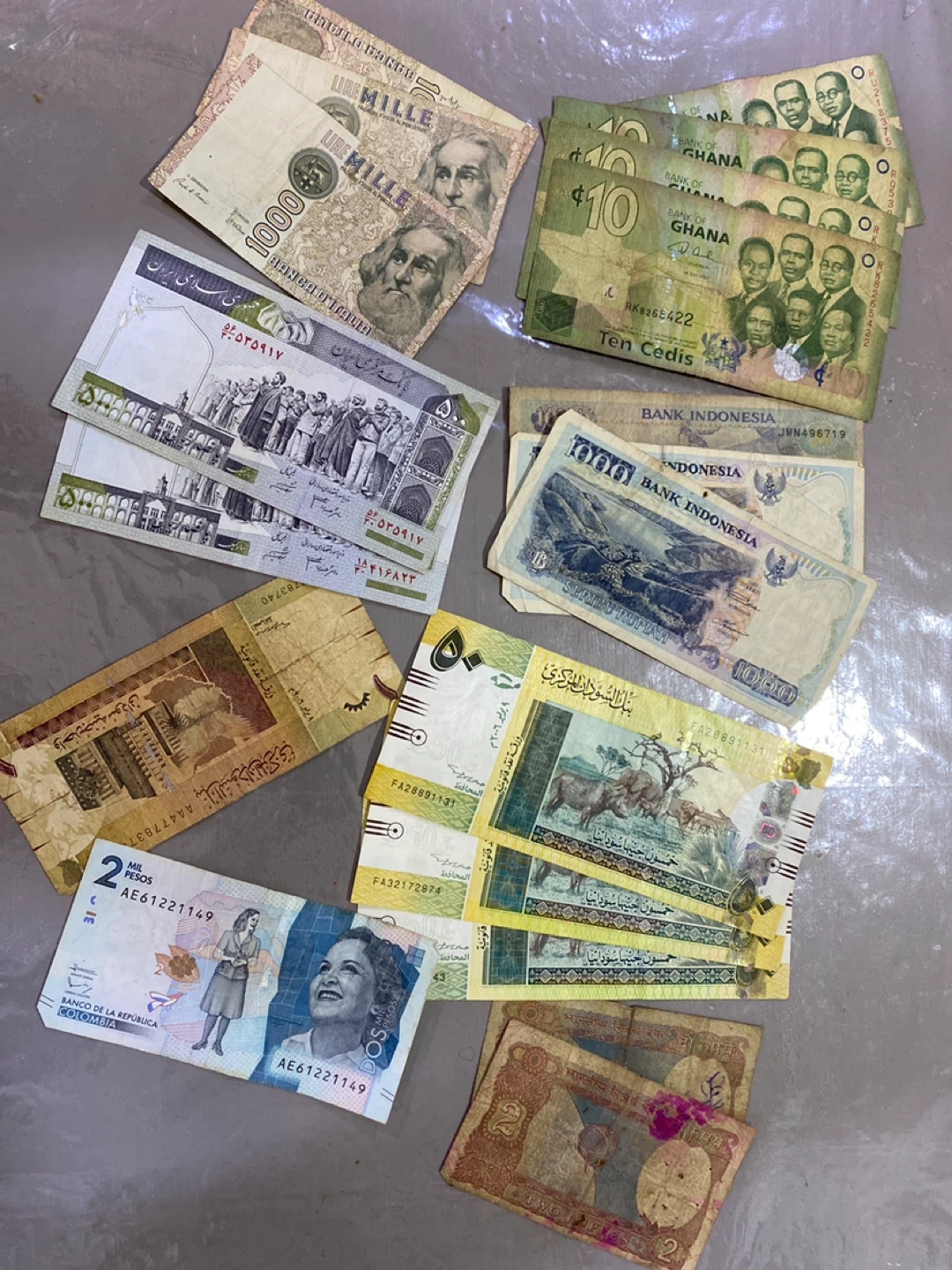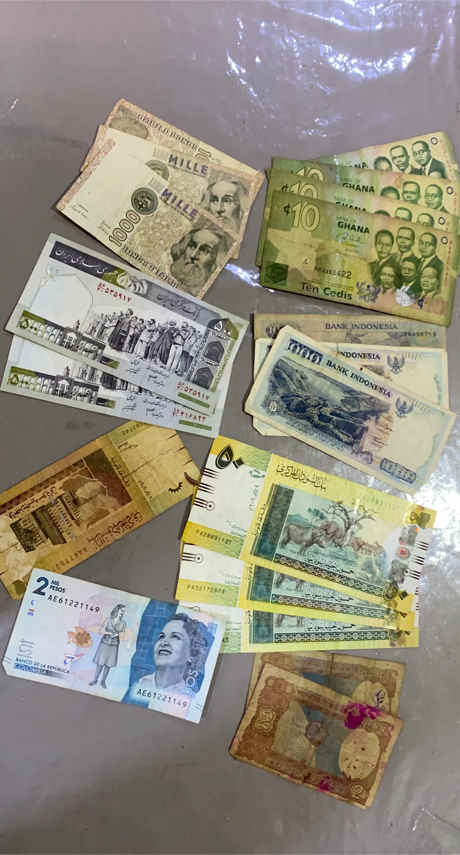 This is a collection of various international banknotes from different countries. Includes currency from Ghana, Indonesia, Iran, and others. Notes have varying denominations and designs.