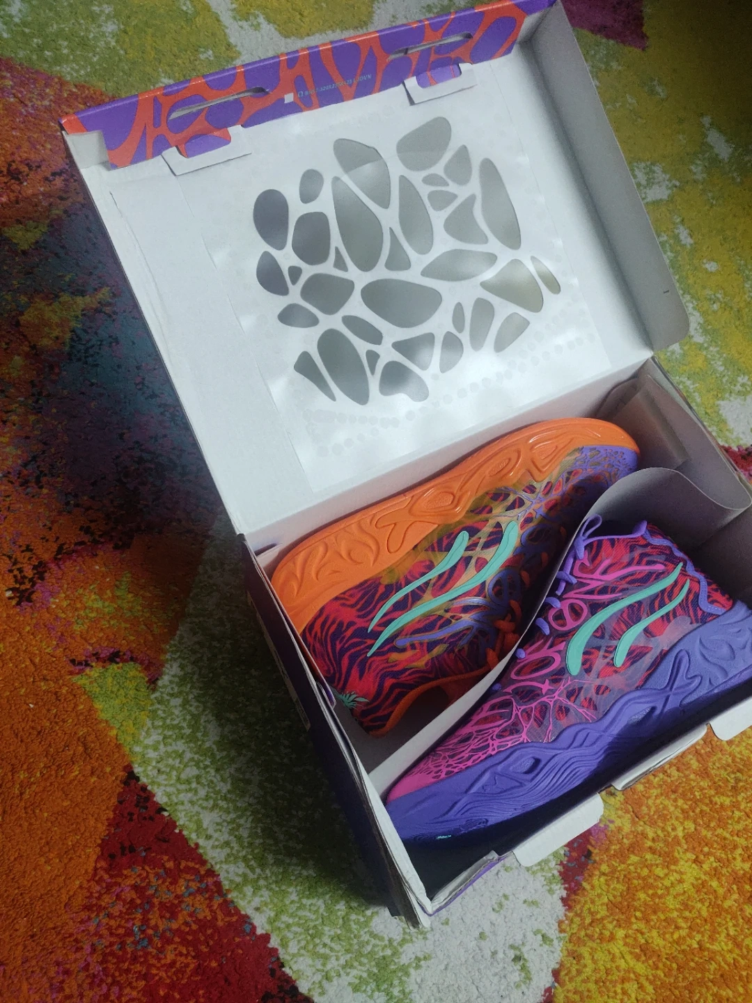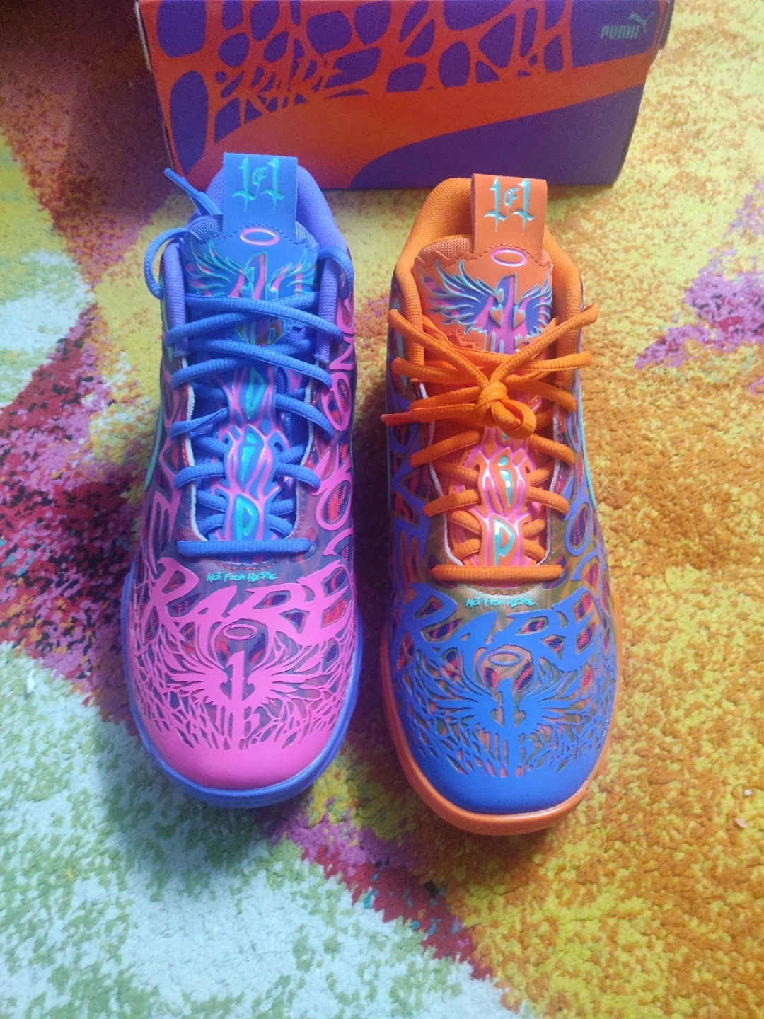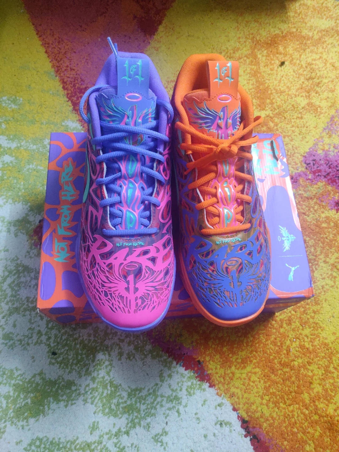 These Puma LaMelo Ball MB.01 basketball shoes come in a vibrant "Not From Here" colourway. woren once to see if it fits which it doesn't,I bought this very recently. They feature a distinctive design with a mix of pink, purple, and orange. The original box is included. This shoe is designed for performance on the court.