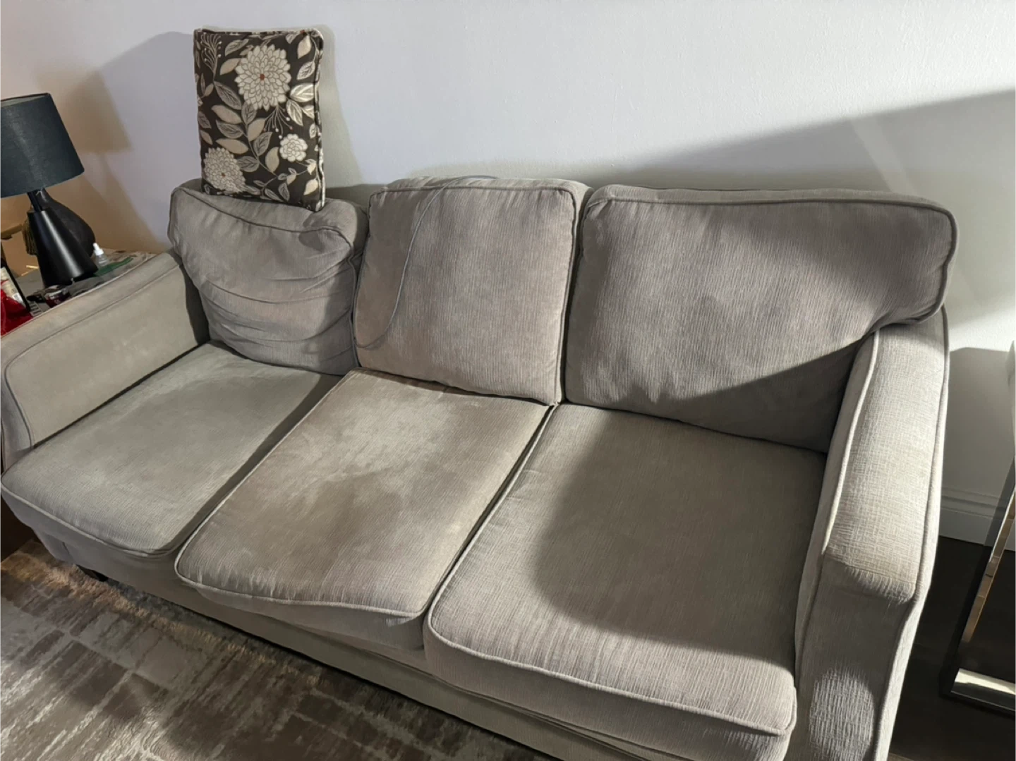 Grey upholstered three-seater sofa. It's got removable seat cushions and includes two decorative throw pillow. Fabric material. No stains.