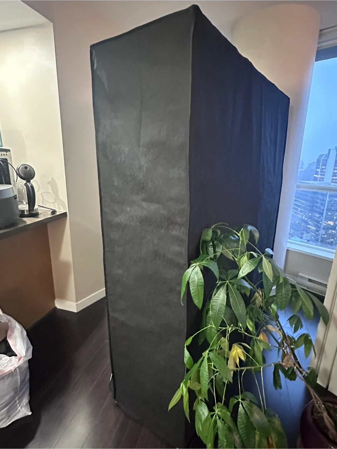 This is a black portable wardrobe closet. It's made of fabric with metal poles and plastic connectors. It has multiple shelves and a hanging rod.