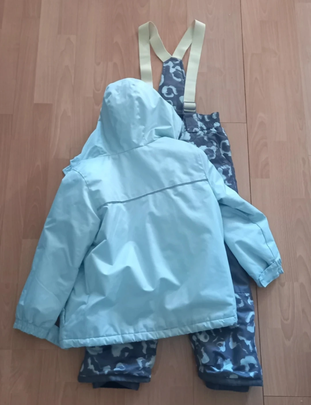 This George kids ski suit set includes a light blue jacket and grey snow pants with a leopard print. The jacket has a hood and zippers up the front. The snow pants have adjustable suspenders. It's great for keeping warm on the slopes!