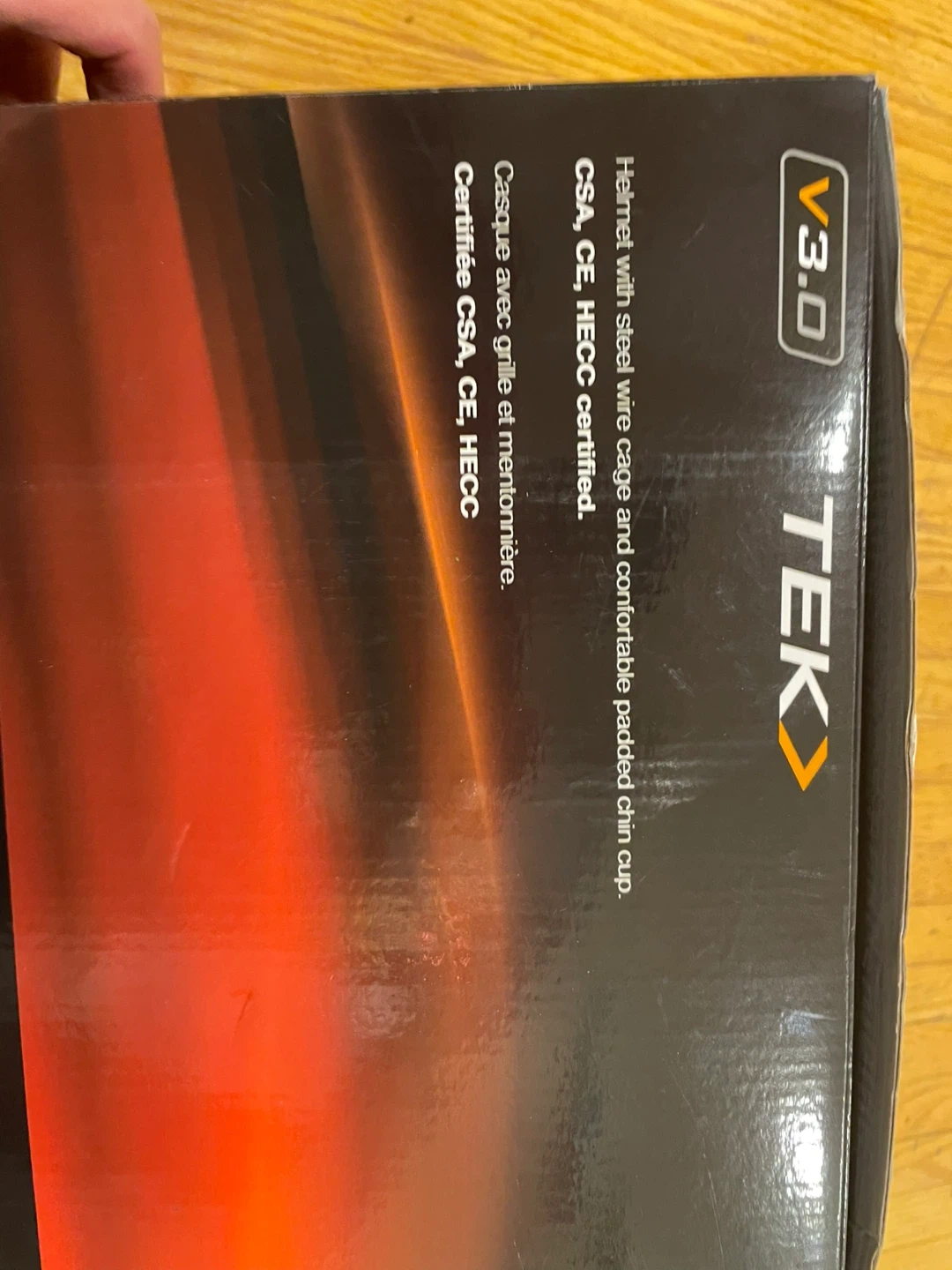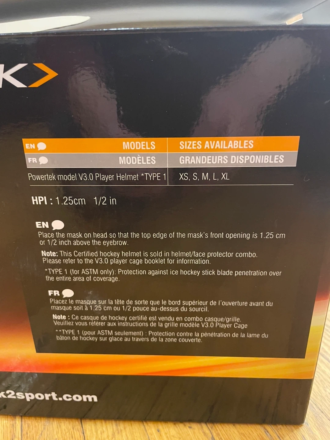 This is a Powertek V3.0 Player Helmet with an integrated cage. It's a certified hockey helmet/face protector combo. The helmet is black and includes adjustable straps.