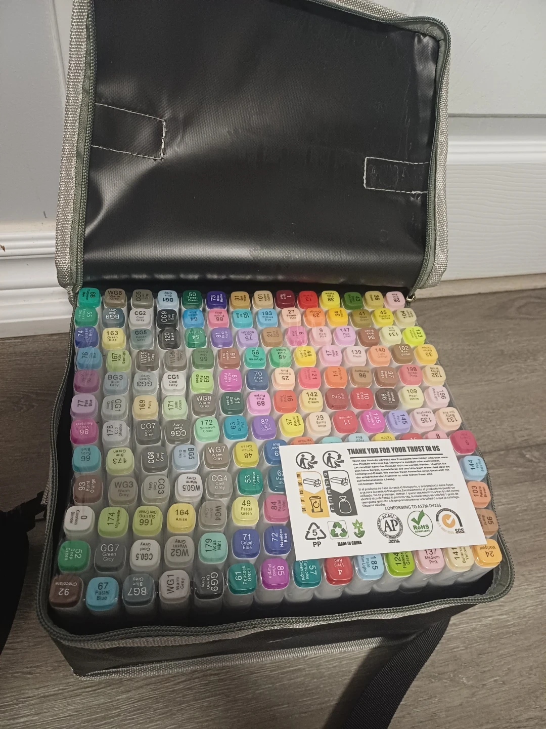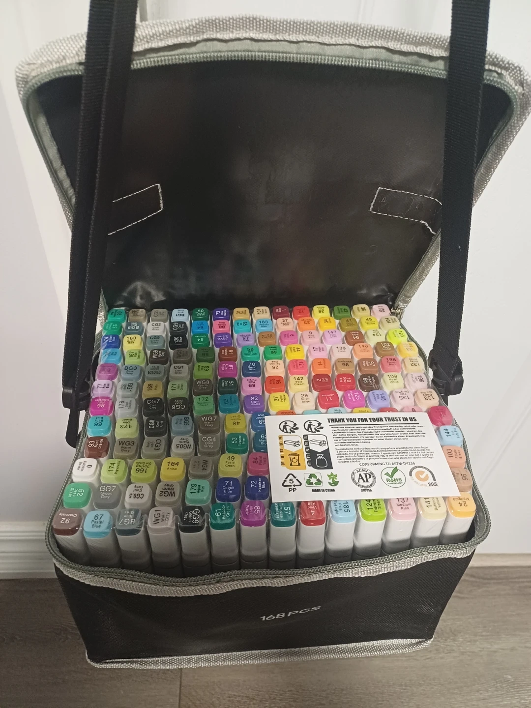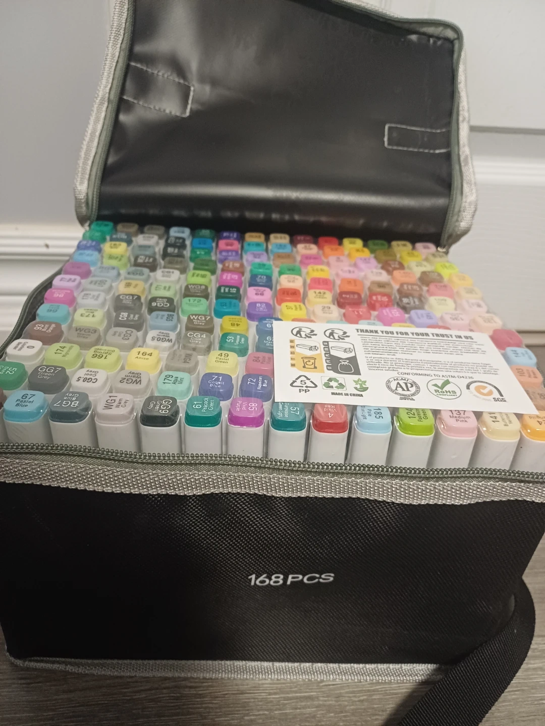 This is a set of 168 markers, including a carrying case for easy transport. The markers offer a wide range of colours for various art projects. They're great for sketching, drawing, and colouring. The case is designed to hold all 168 markers neatly.