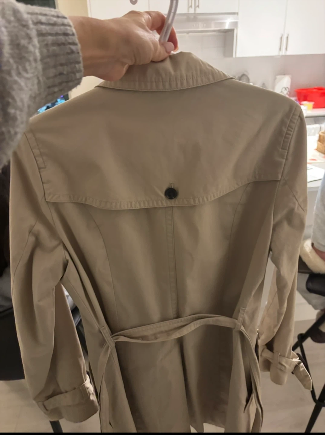 A classic Banana Republic tan trench coat. Double-breasted with button closure and a tie belt. This coat is water-resistant and perfect for transitional weather.