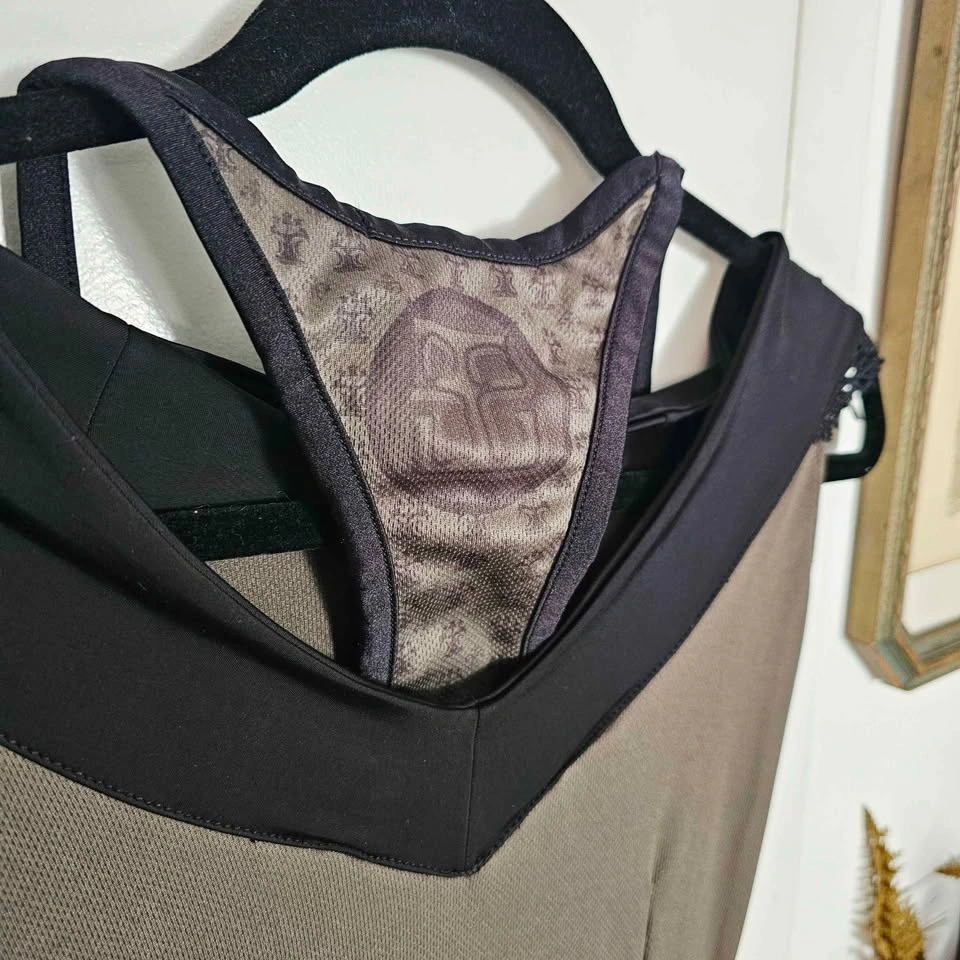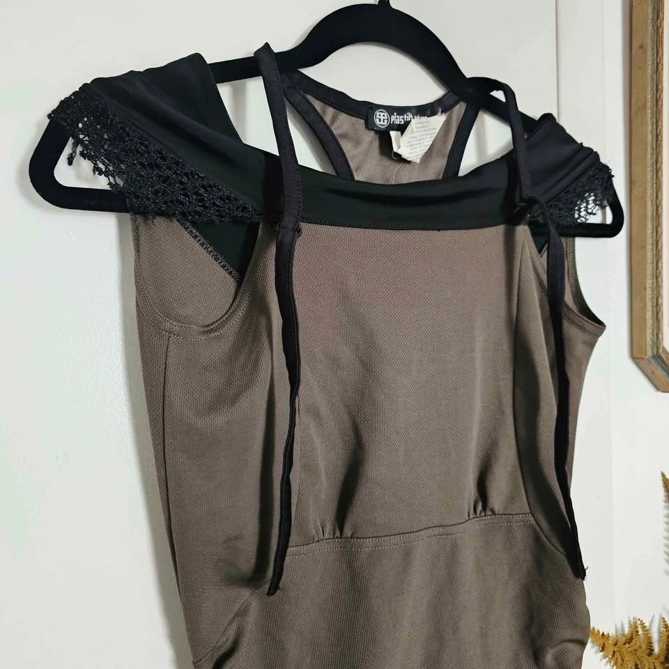Dress has adjustable skinny shoulder straps with a lacy black off-shoulder overlay. It is ruched at the sides for a super flattering fit, with more black lace at the hips/ thighs. The back has a mesh racerback section with patterning and a Plastik Wrap logo. It is very comfortable, stretchy and breathable. Perfect for industrial or cybergoth clubwear, or any futuristic looks.