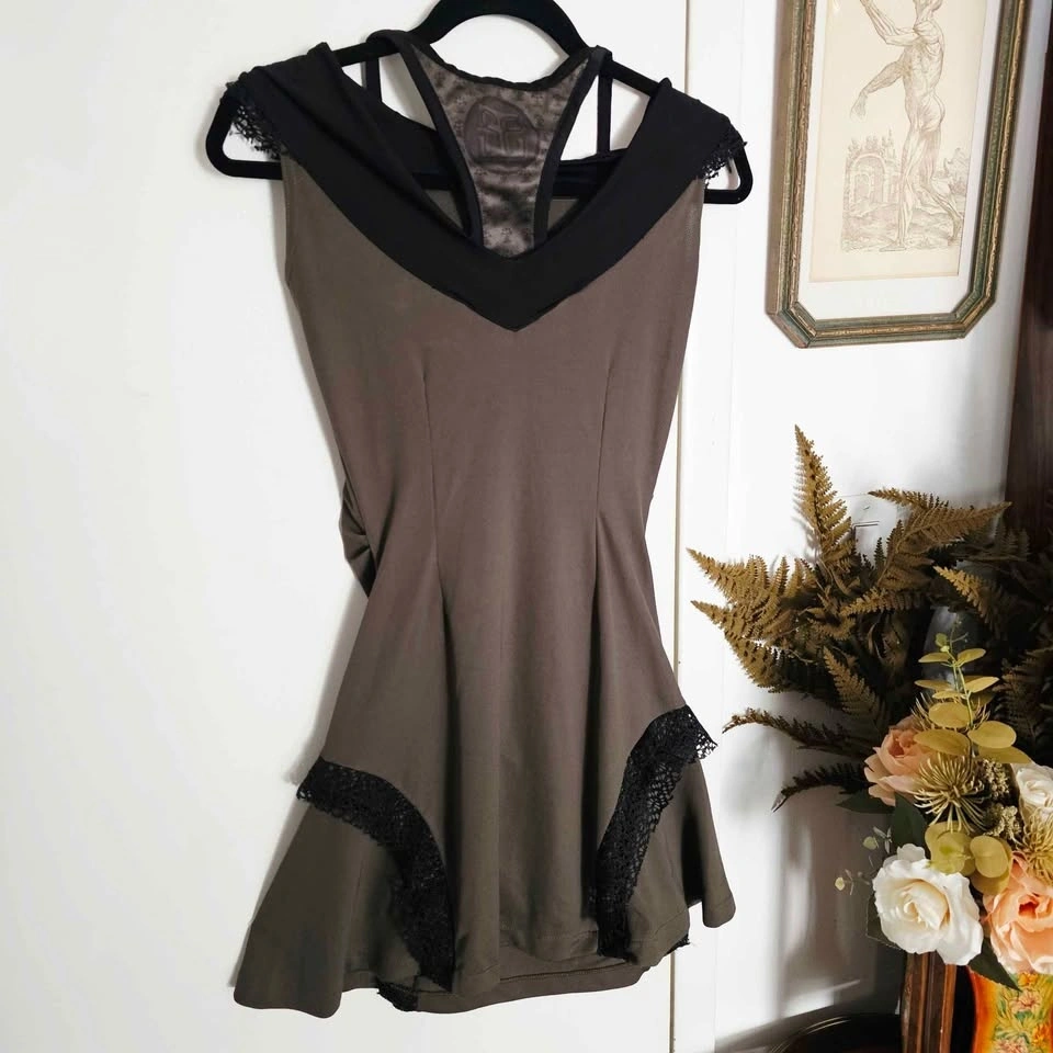 Army green and black goth fit-and-flare mini dress with lace, ruching and lots more. An older limited edition piece from cult favorite independent Canadian goth/ cybergoth club wear brand Plastik Wrap.