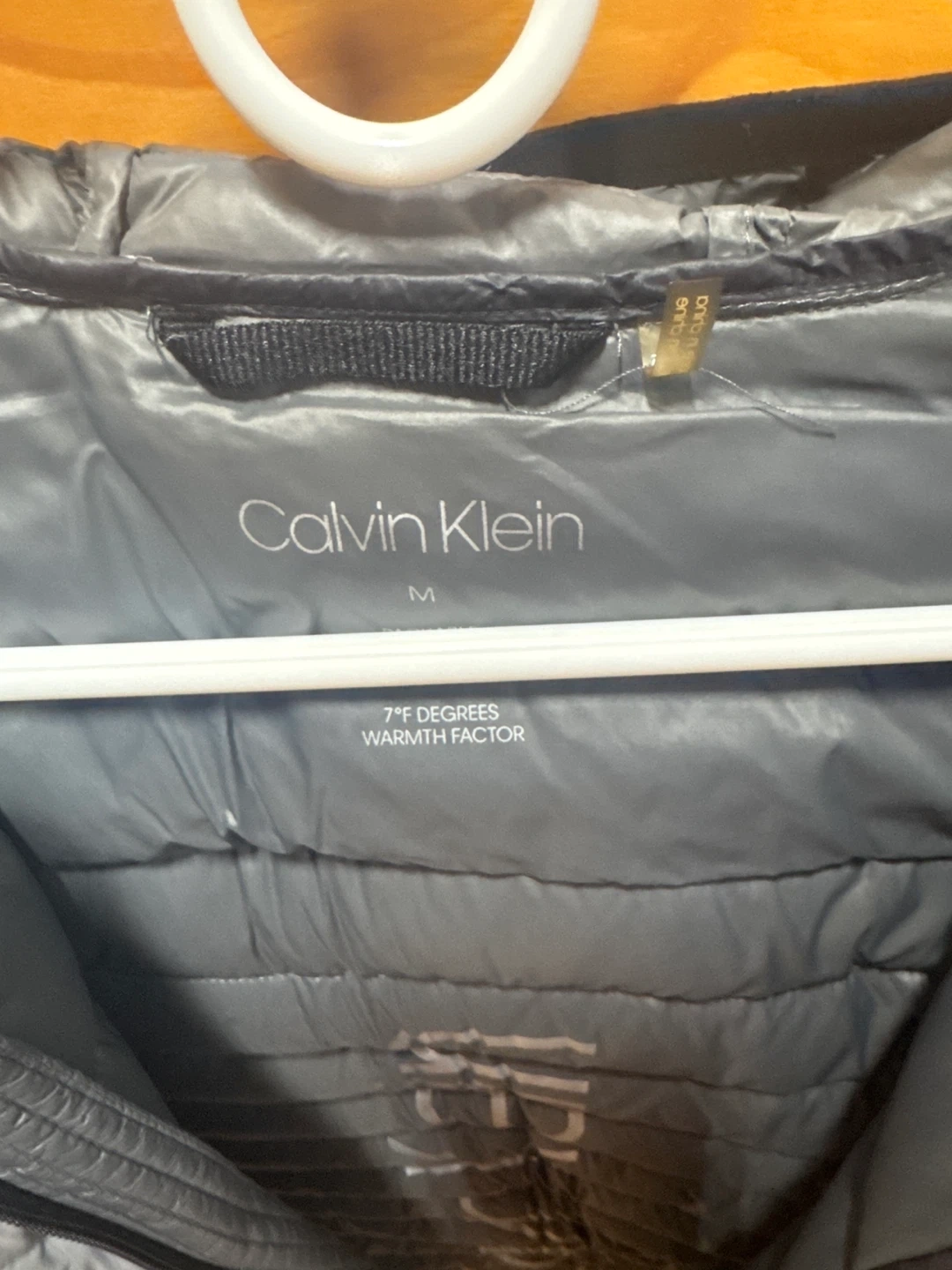 Lightweight gray puffer jacket from Calvin Klein. It's a size medium with a warmth factor of 7 degrees. The jacket has a full zip front and two zip pockets. Great for today’s cold weather!