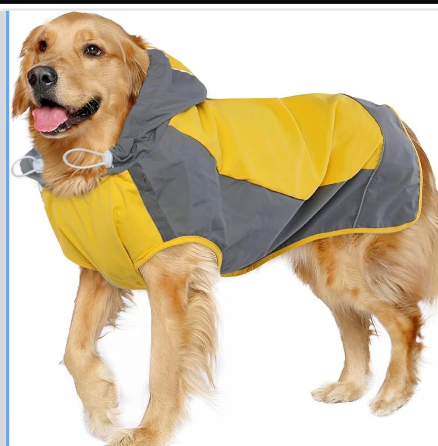 This dog coat is yellow and grey with a hood. It's designed to keep your furry friend warm during colder months. The material is water-resistant.
