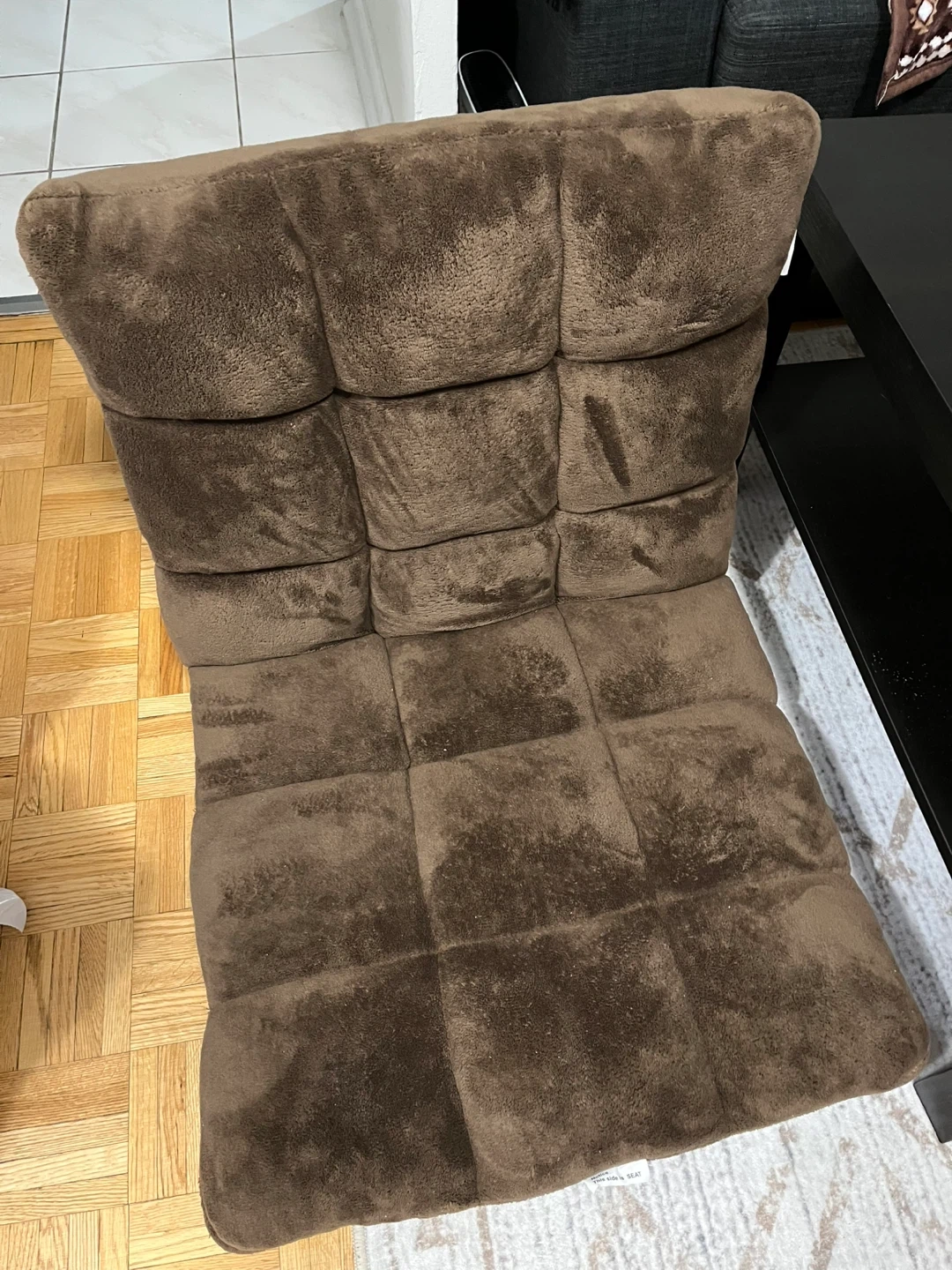 Brown tufted floor chair with plush fabric. It's great for relaxing on the floor or in a dorm room. Provides comfortable seating for reading or gaming. This chair offers cozy support for any casual space.