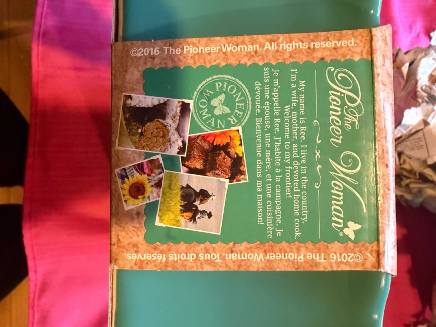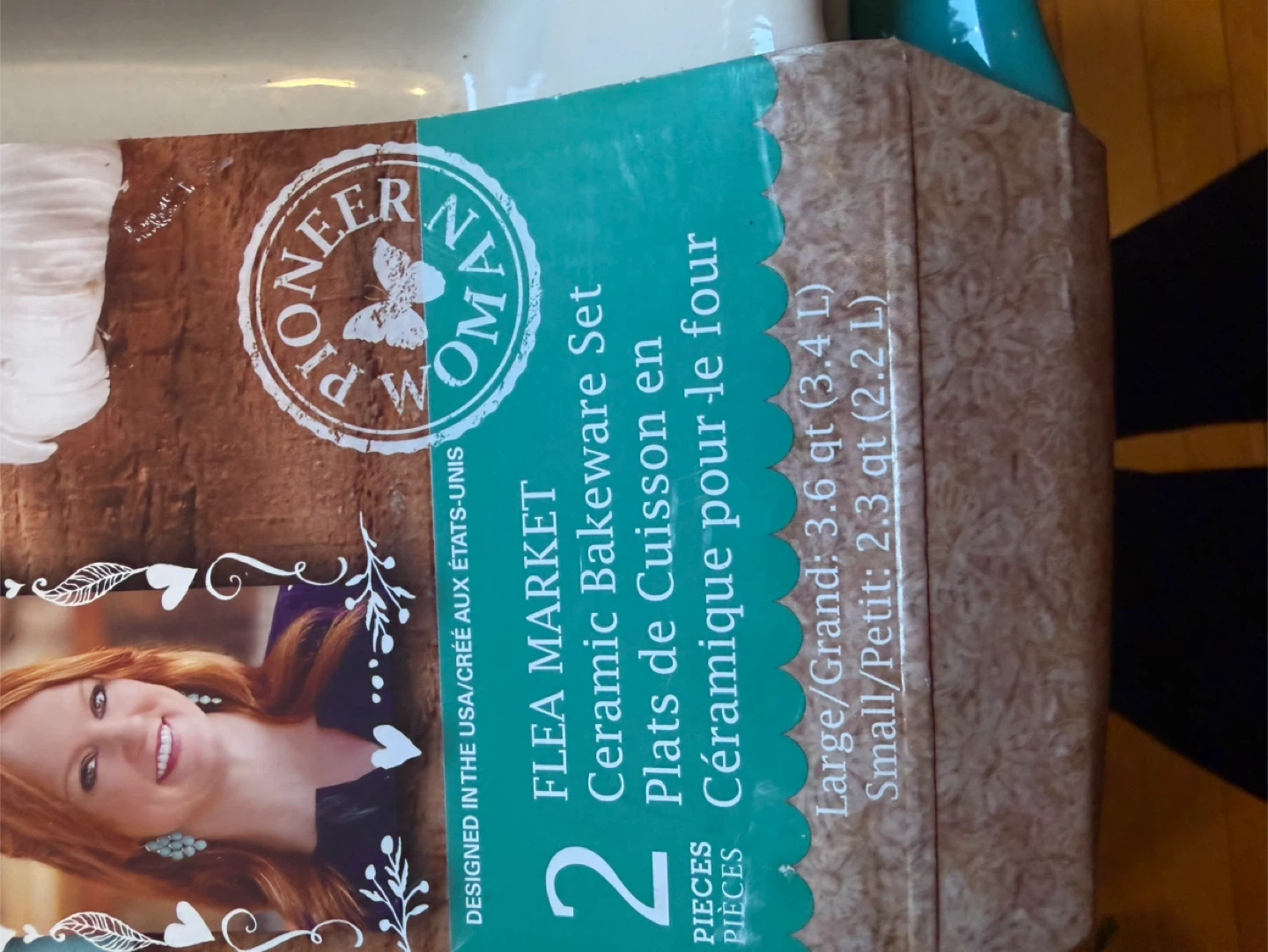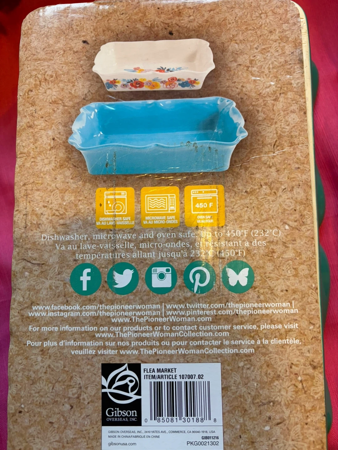 This is a 2-piece ceramic bakeware set from The Pioneer Woman's Flea Market collection. It includes one large dish measuring 3.6 qt and one small dish measuring 2.3 qt. Both pieces are dishwasher, microwave, and oven safe up to 450°F.